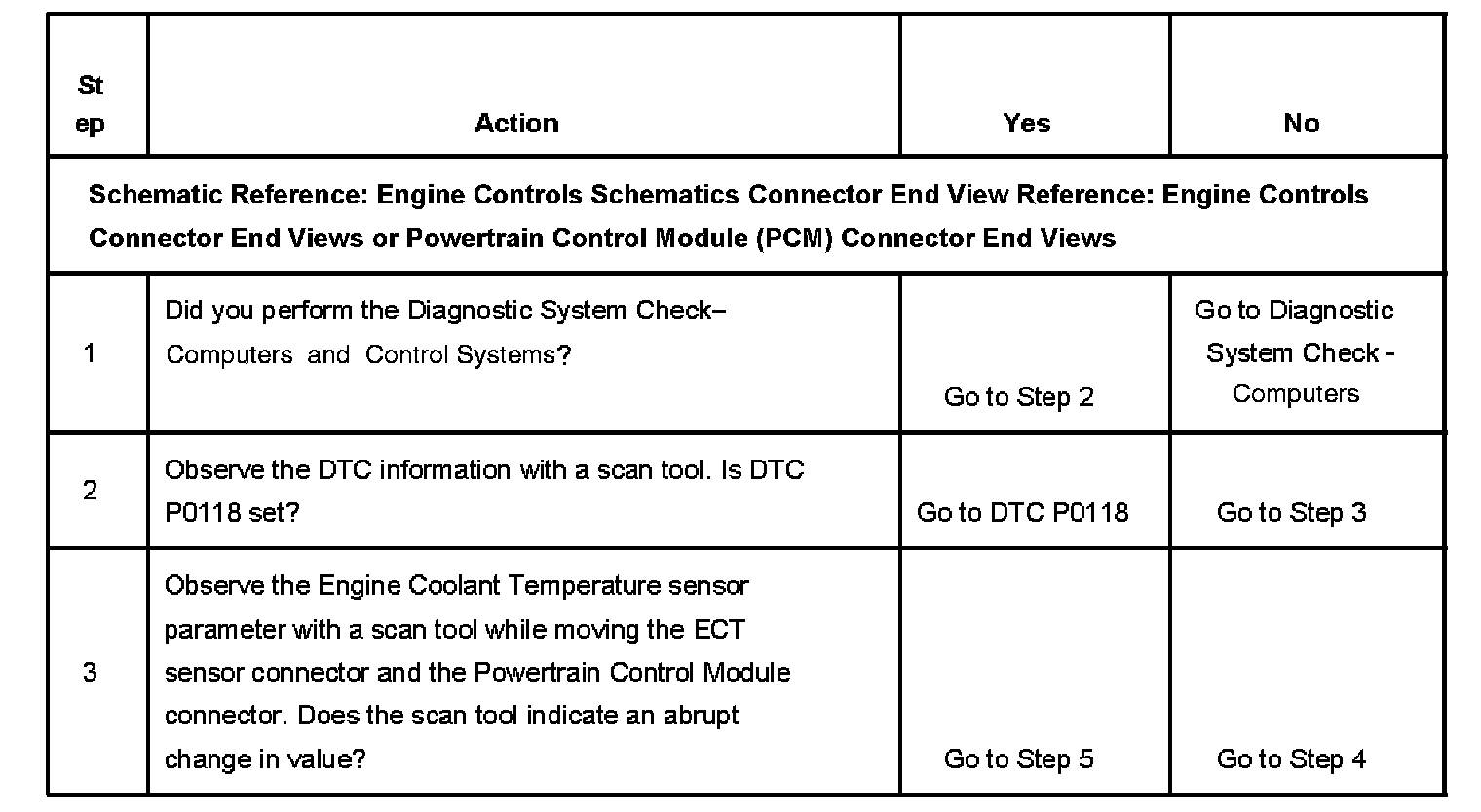 CIRCUIT DESCRIPTIONThe engine coolant temperature (ECT) sensor is a variable resistor, that measures the temperature of the engine coolant. The powertrain control module (PCM) supplies 5 volts to the ECT signal circuit and a ground for the ECT low reference circuit. When the ECT is cold, the sensor resistance is high. When the ECT increases, the sensor resistance decreases. With high sensor resistance, the PCM detects a high voltage on the ECT signal circuit. With lower sensor resistance, the PCM detects a lower voltage on the ECT signal circuit. If the PCM detects an excessively high signal voltage, which is a low temperature indication, DTC P1115 sets.
