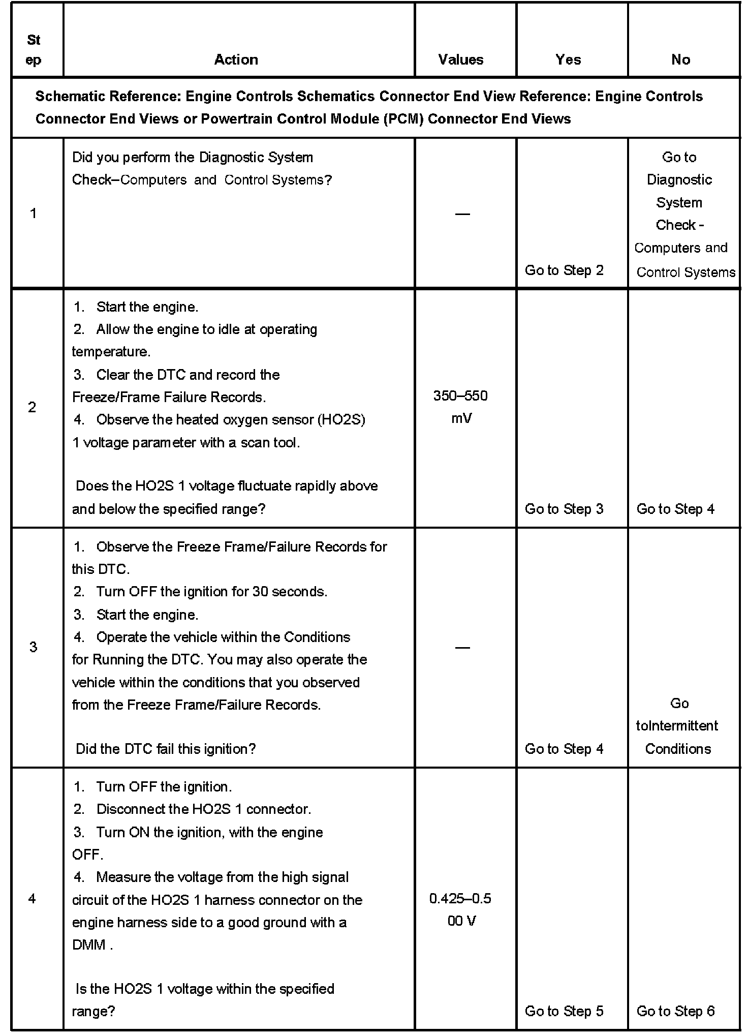 CIRCUIT DESCRIPTIONHeated oxygen sensors (HO2S) are used for fuel control and post catalyst monitoring. Each HO2S compares the oxygen content of the surrounding air with the oxygen content of the exhaust stream. When the vehicle is first started, the powertrain control module (PCM) operates in an Open Loop mode, ignoring the HO2S signal voltage when calculating the air-to-fuel ratio. The PCM supplies the HO2S with a reference, or bias, voltage of about 450 mV. The HO2S generates a voltage within a range of 0-1,000 mV that fluctuates above and below bias voltage once in Closed Loop. A high HO2S voltage output indicates a rich fuel mixture. A low HO2S voltage output indicates a lean mixture. Heating elements inside the HO2S minimize the time required for the sensors to reach operating temperature, and to provide an accurate voltage signal. If the PCM detects that the HO2S 1 voltage did not switch enough times during a calibrated time period, DTC P1133 will set.