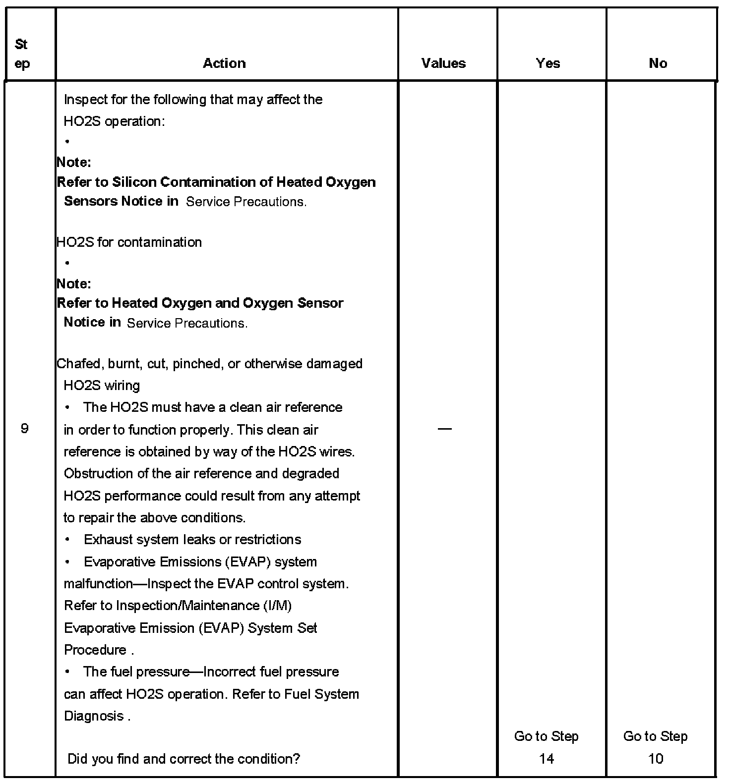 9. The conditions listed in the table may contribute to the failure of the HO2S. The conditions listed apply only to this type of failure.
