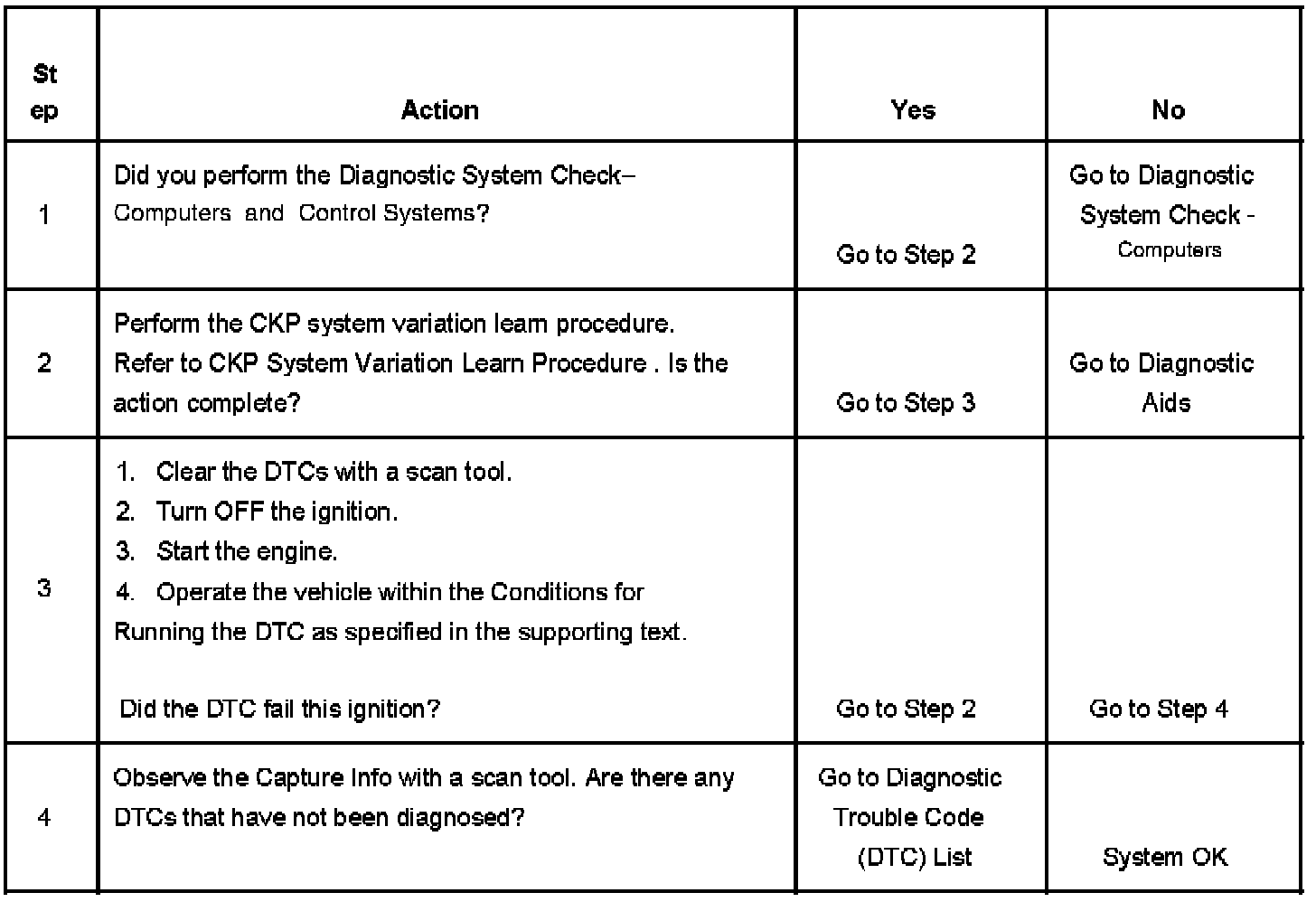 The CKP system variation compensating values are stored in PCM memory after a learn procedure has been performed. If the actual CKP variation is not within the CKP system variation compensating values stored in the PCM, DTC P0300 may set.