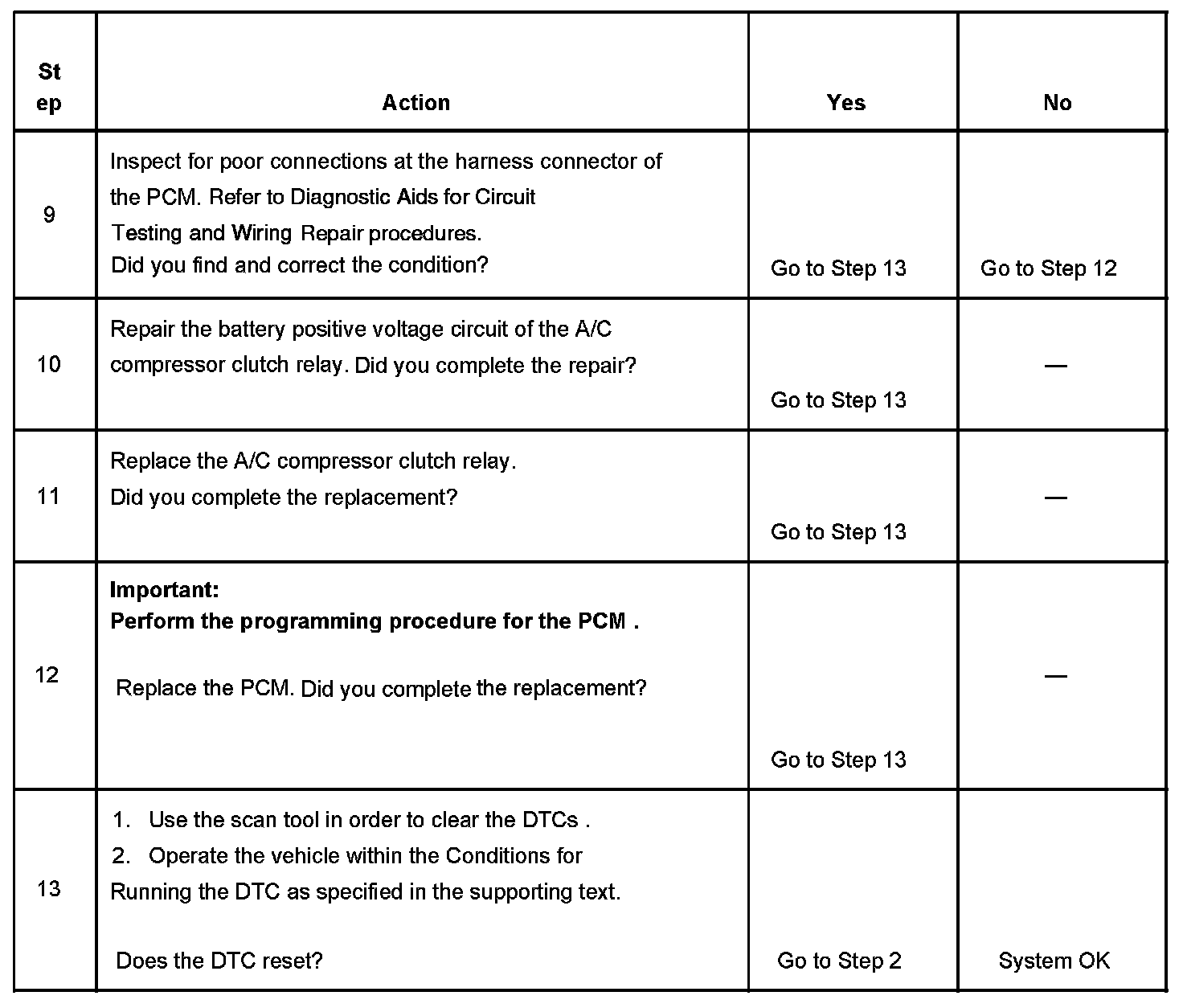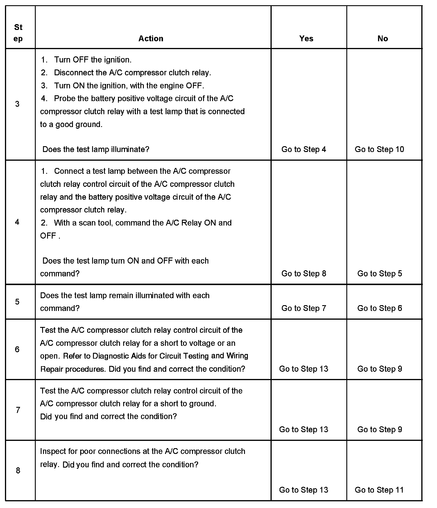 CIRCUIT DESCRIPTIONBattery positive voltage is supplied to the A/C compressor clutch relay. The powertrain control module (PCM) controls the relay by grounding the control circuit through an internal solid state device called a driver. The primary function of the driver is to supply the ground for the component being controlled. Each driver has a fault line which is monitored by the PCM. When the PCM is commanding a component on, the voltage of the control circuit should be near 0 volts. When the PCM is commanding the control circuit to a component off, the voltage potential of the circuit should be near battery voltage. If the fault detection circuit senses a voltage other than what is expected, this DTC will set.