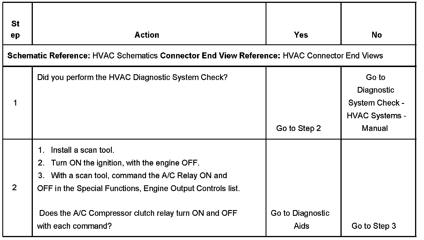2. Listen for an audible click when the A/C compressor clutch relay operates. Command both the ON and OFF states. Repeat the commands as necessary.
