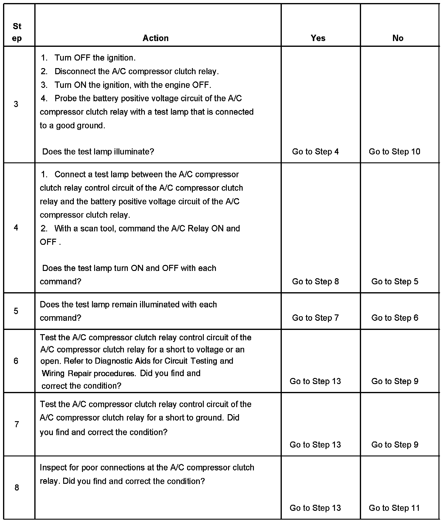 CIRCUIT DESCRIPTIONBattery positive voltage is supplied to the A/C compressor clutch relay. The powertrain control module (PCM) controls the relay by grounding the control circuit through an internal solid state device called a driver. The primary function of the driver is to supply the ground for the component being controlled. Each driver has a fault line which is monitored by the PCM. When the PCM is commanding a component on, the voltage of the control circuit should be near 0 volts. When the PCM is commanding the control circuit to a component off, the voltage potential of the circuit should be near battery voltage. If the fault detection circuit senses a voltage other than what is expected, this DTC will set.