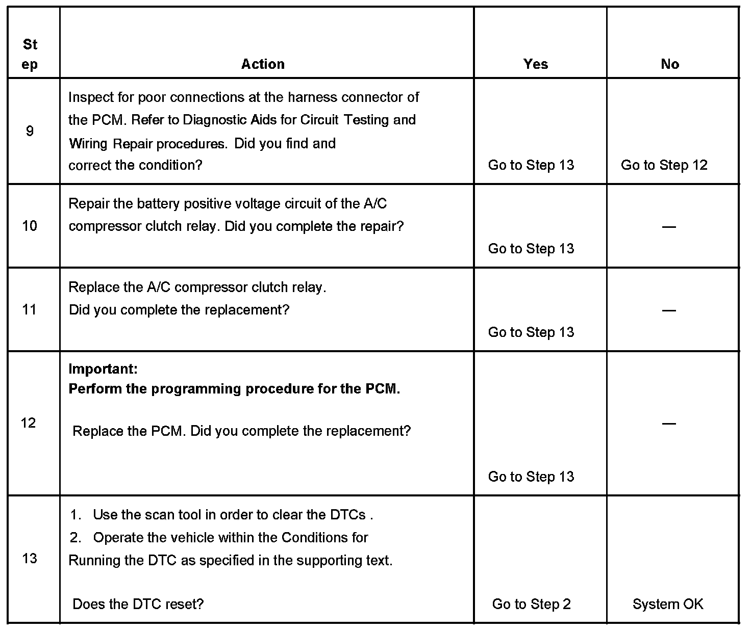 The numbers below refer to the step numbers on the diagnostic table.