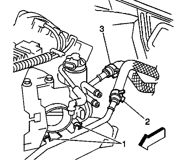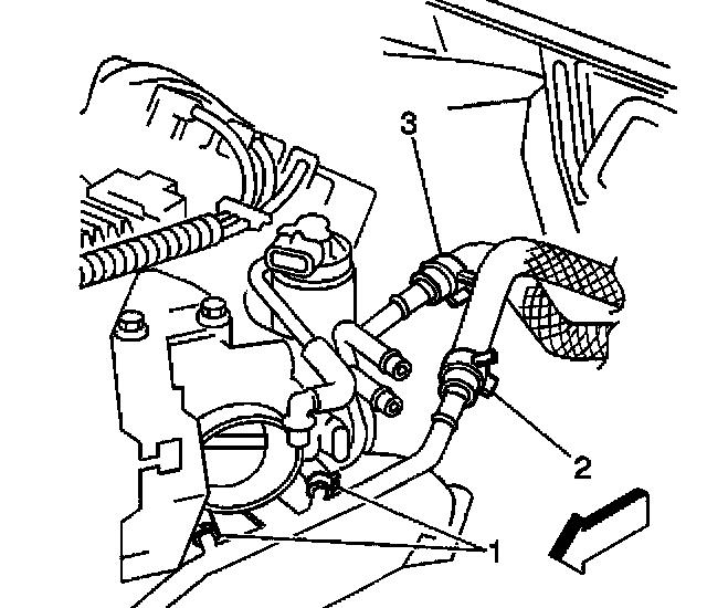9. Reposition and connect the coolant outlet (2) and inlet (3) bypass hoses.