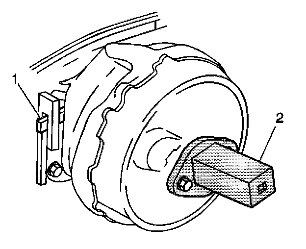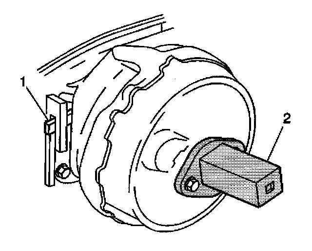 2. Turn the vacuum brake booster clockwise with a ratchet on the J 22805-B (2). DO NOT use a flat bladed tool in the locking tab to install the vacuum brake booster. When the vacuum brake booster is correctly installed, the locking tab (1) slides up the flange and engages the locking notch.