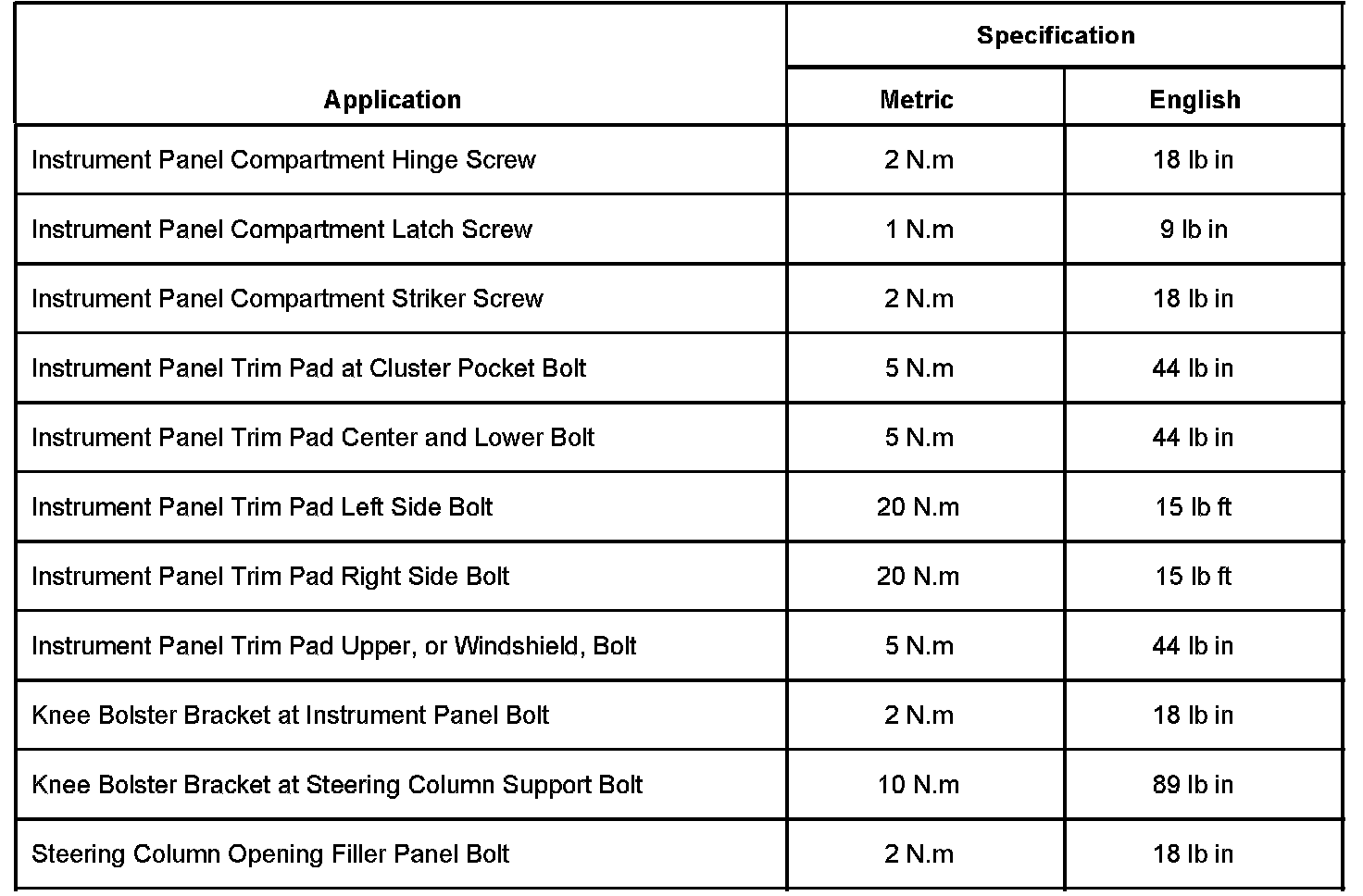 Instrument Panel, Gauges and Warning Indicators: Specifications