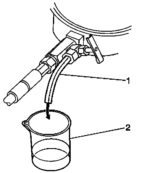 5. Place the bleed hose (1) of the fuel pressure gage into the 100 ml beaker (2).