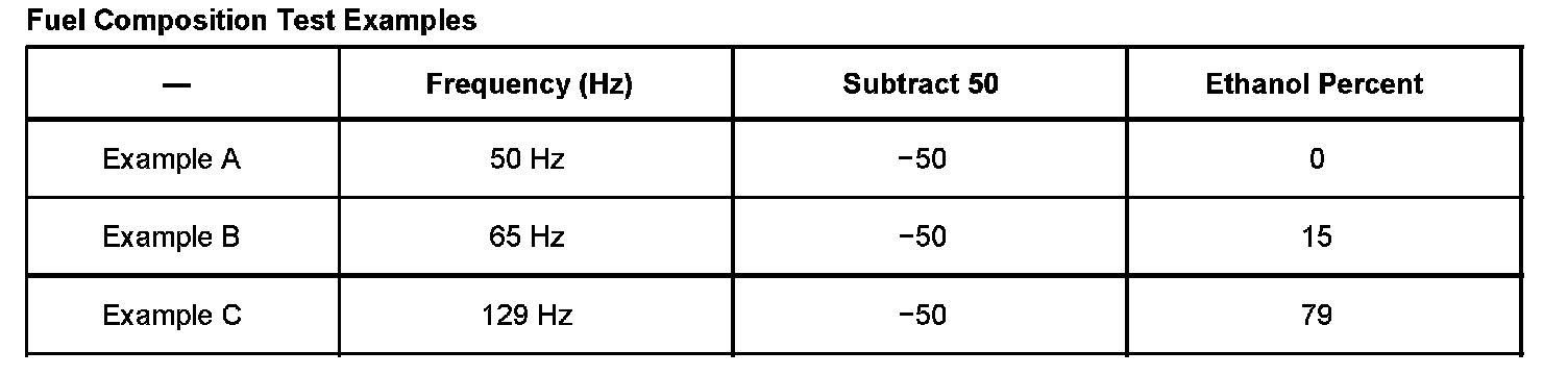 12. Subtract 50 from the reading on the DMM to obtain the percentage of alcohol in the fuel sample. Refer to the examples in the table.