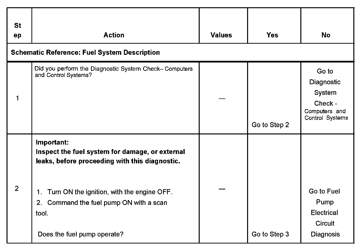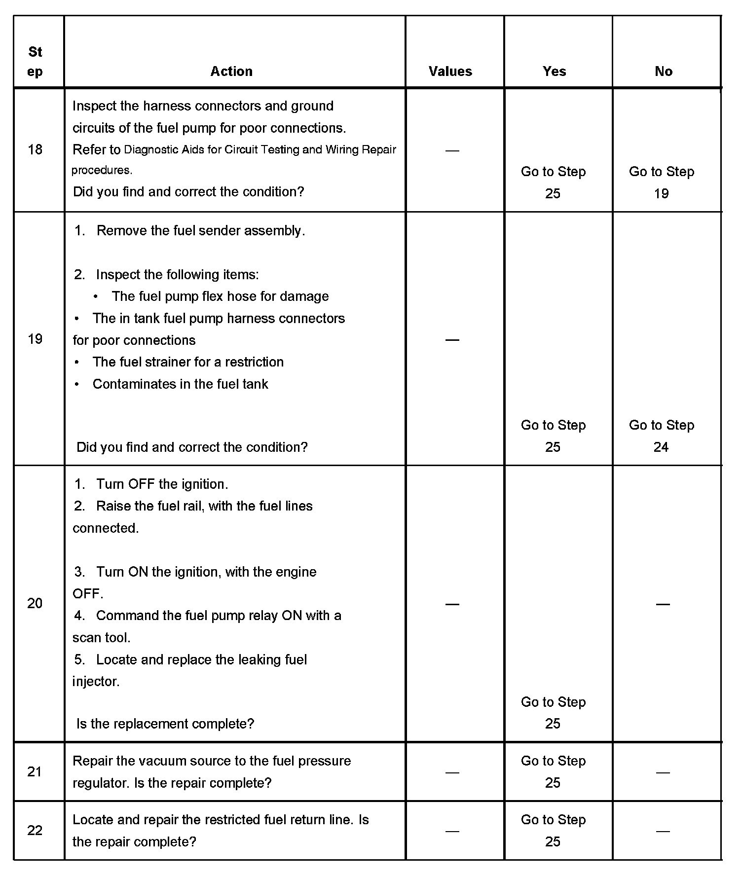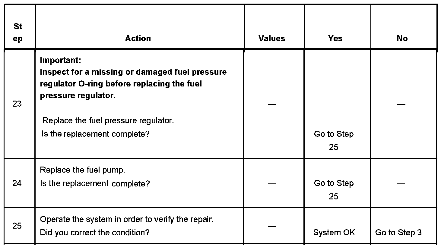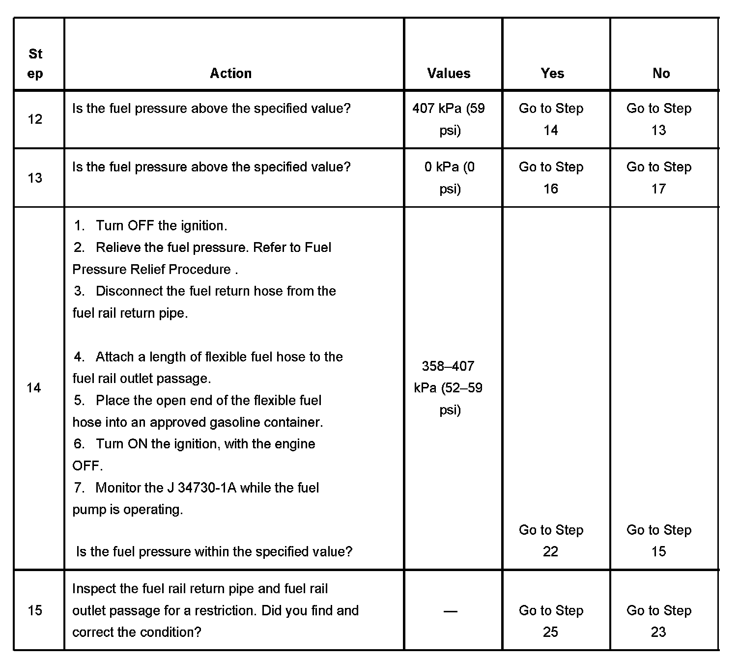 14. This step tests for a restricted fuel return pipe. If the fuel pressure is within the specified values, a restriction in the fuel return pipe is indicated.