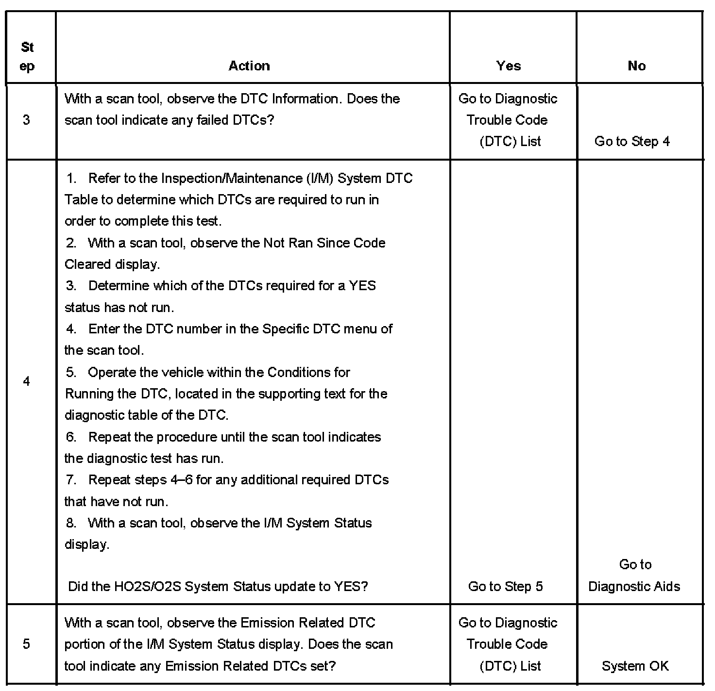 3. This step identifies a first failure of a type B DTC. A DTC only appears on the I/M System Status display when the DTC becomes a MIL illuminating DTC. This occurs on the second failure of a type B DTC. A first failure of a type B DTC will not allow the I/M System Status to update to YES. Refer to Diagnostic Aids.