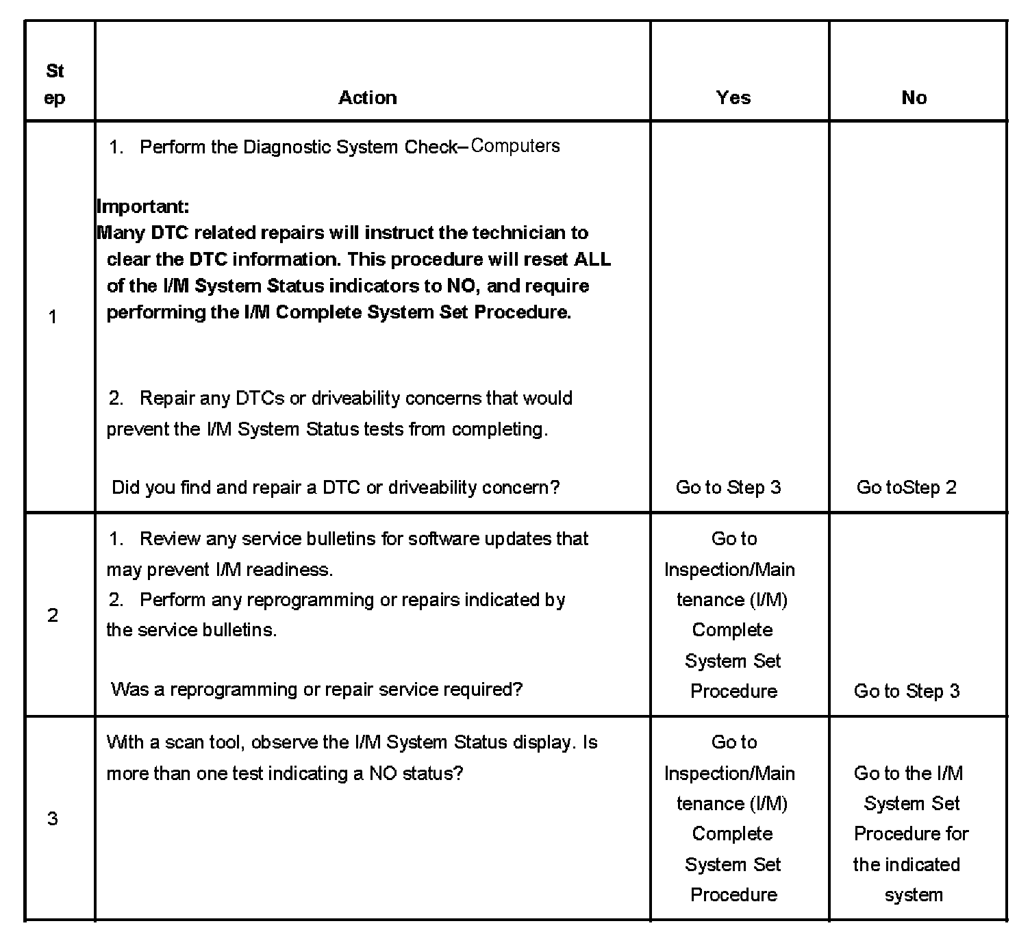 2. Anytime a control module is reprogrammed or the diagnostic trouble codes are cleared as part of a repair procedure, all the I/M System Status indicators will reset to NO.