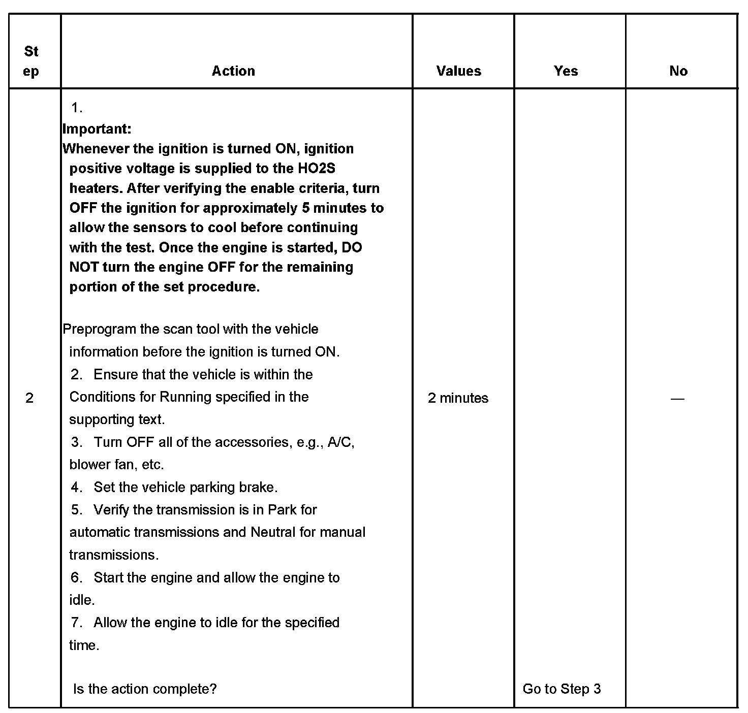 Rough road conditions may prevent some of the tests from running. Extreme high or low ambient temperatures may prevent tests such as heated oxygen sensor (HO2S) heater and evaporative emission (EVAP) system from initiating. If a step is interrupted before completion, perform the remaining portion of the set procedures. Any portion of the set procedure that requires the engine at operating temperature may be repeated. This allows most of the diagnostics to run and the remaining tests can be performed using the individual System Set Procedures.