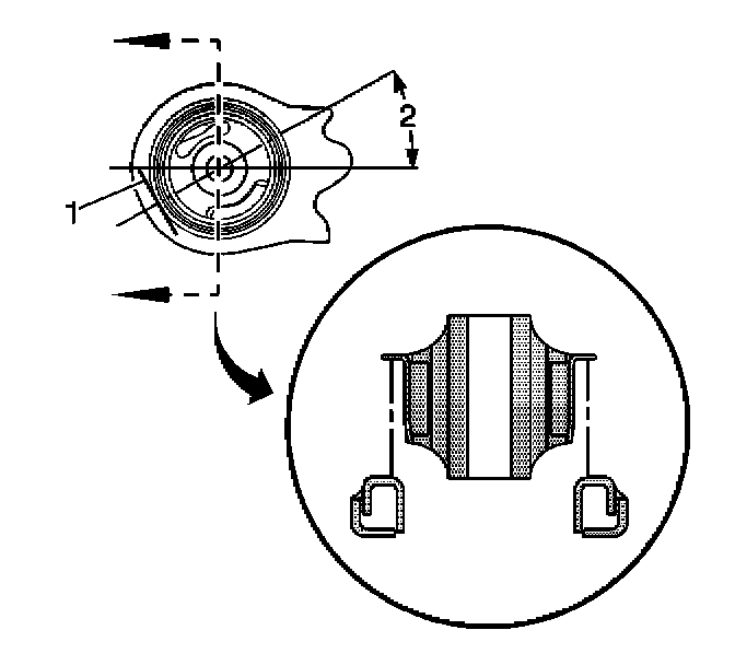 1. Align the flat edge of the bushing flange to the mark in the control arm (1). Ensure that the flat edge of the bushing flange is 30 degrees (2) from the centerline of the lower control arm. Ensure that the thin slot in the bushing is facing outboard.
