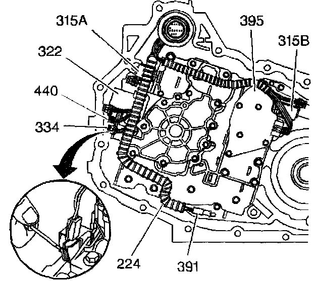 2. Use a flat-bladed tool to disconnect the electrical connectors from the solenoid valves (31 5A, 31 5B, 322, 334 and 440), the TFP manual valve position switch (395) and the temperature sensor (391).