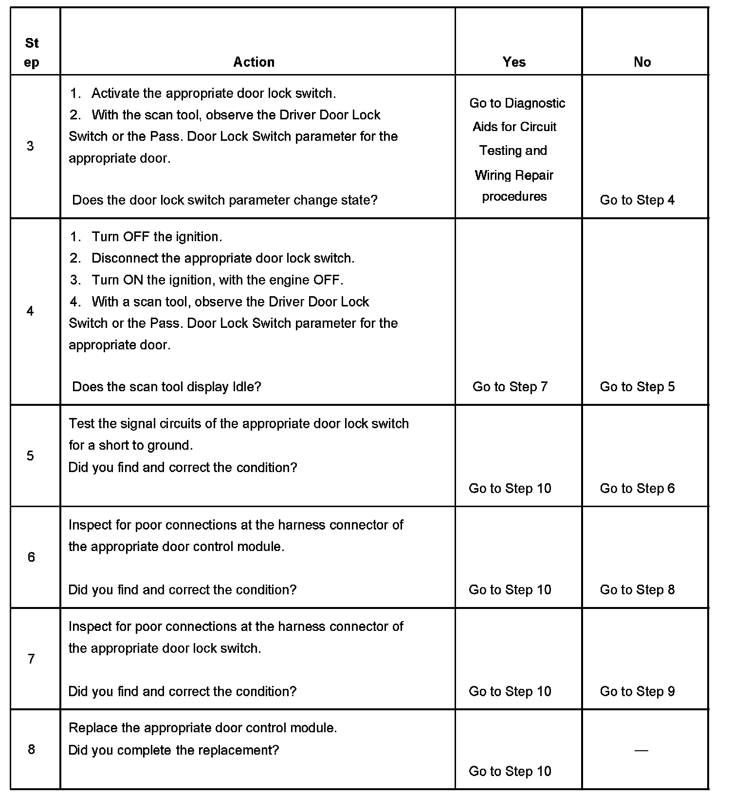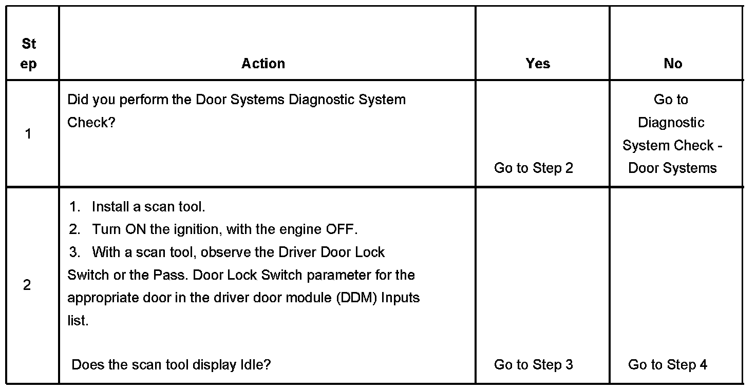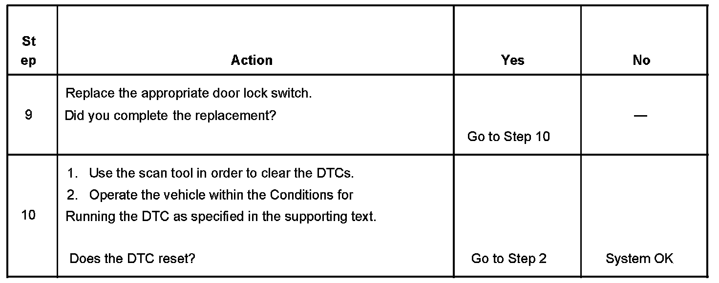 The switch that failed and generated this diagnostic trouble code (DTC) is wired to either the driver door switch assembly (DDSA) or the passenger door module (PDM). The DDSA or the PDM includes the switch state in the message it sends to the driver door module (DDM) via the power door serial data circuit. The DDM sends the switch message to the rear integration module (RIM), which is the master of all lock operations, as a Class 2 message. The RIM checks all conditions and if all conditions are correct, sends its OK to the DDM. When the OK message is received, the DDM sends the required signal to all other door modules via the power door serial data message system.