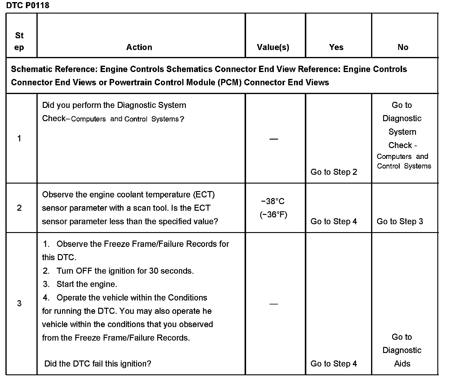 CIRCUIT DESCRIPTIONThe engine coolant temperature (ECT) sensor is a variable resistor, that measures the temperature of the engine coolant. The ECT sensor has a signal circuit and a low reference circuit. The powertrain control module (PCM) supplies 5 volts to the ECT signal circuit and a ground for the ECT low reference circuit. When the ECT is cold, the sensor resistance is high. When the ECT increases, the sensor resistance decreases. With high sensor resistance, the PCM detects a high voltage on the ECT signal circuit. With lower sensor resistance, the PCM detects a lower voltage on the ECT signal circuit. If the PCM detects an excessively high ECT signal voltage, which is a low temperature indication, DTC P0118 sets.
