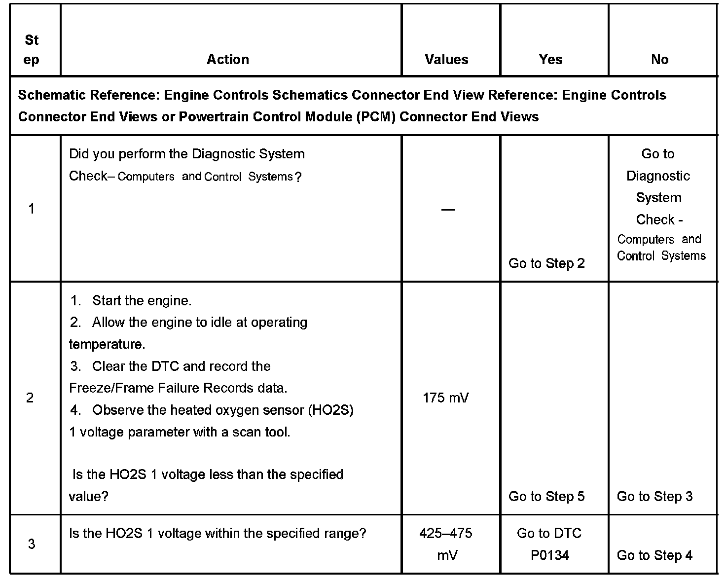 CIRCUIT DESCRIPTIONHeated oxygen sensors (HO2S) are used for fuel control and post catalyst monitoring. Each HO2S compares the oxygen content of the surrounding air with the oxygen content of the exhaust stream. When the vehicle is first started, the powertrain control module (PCM) operates in an Open Loop mode, ignoring the HO2S signal voltage when calculating the air-to-fuel ratio. The PCM supplies the HO2S with a reference, or bias, voltage of about 450 mV.The HO2S generates a voltage within a range of 0-1,000 mV that fluctuates above and below bias voltage once in Closed Loop. A high HO2S voltage output indicates a rich fuel mixture. A low HO2S voltage output indicates a lean mixture. Heating elements inside the HO2S minimize the time required for the sensors to reach operating temperature, and to provide an accurate voltage signal. If the PCM detects that the HO2S 1 voltage remains below a calibrated amount for an excessive amount of time, DTC P0131 will set.