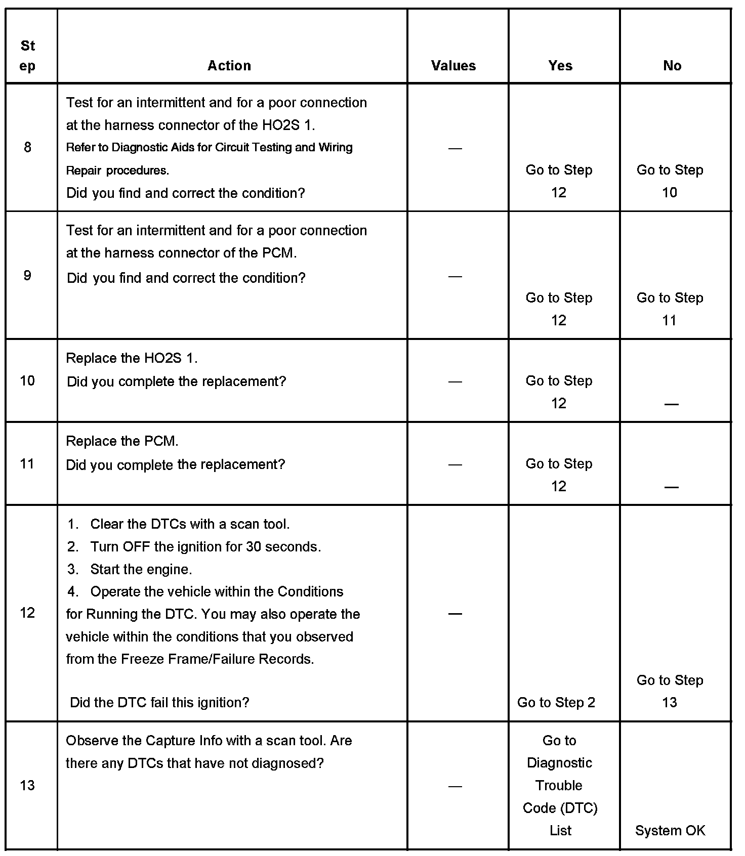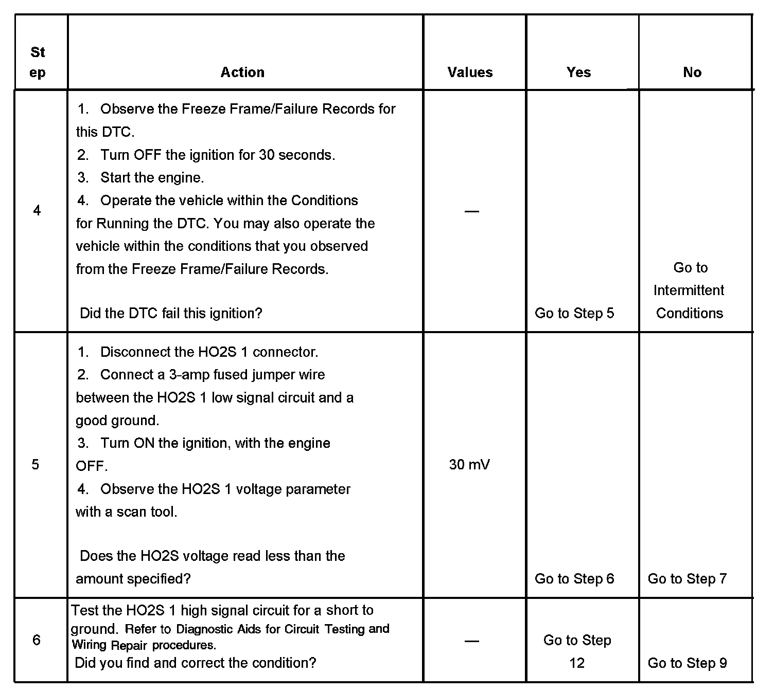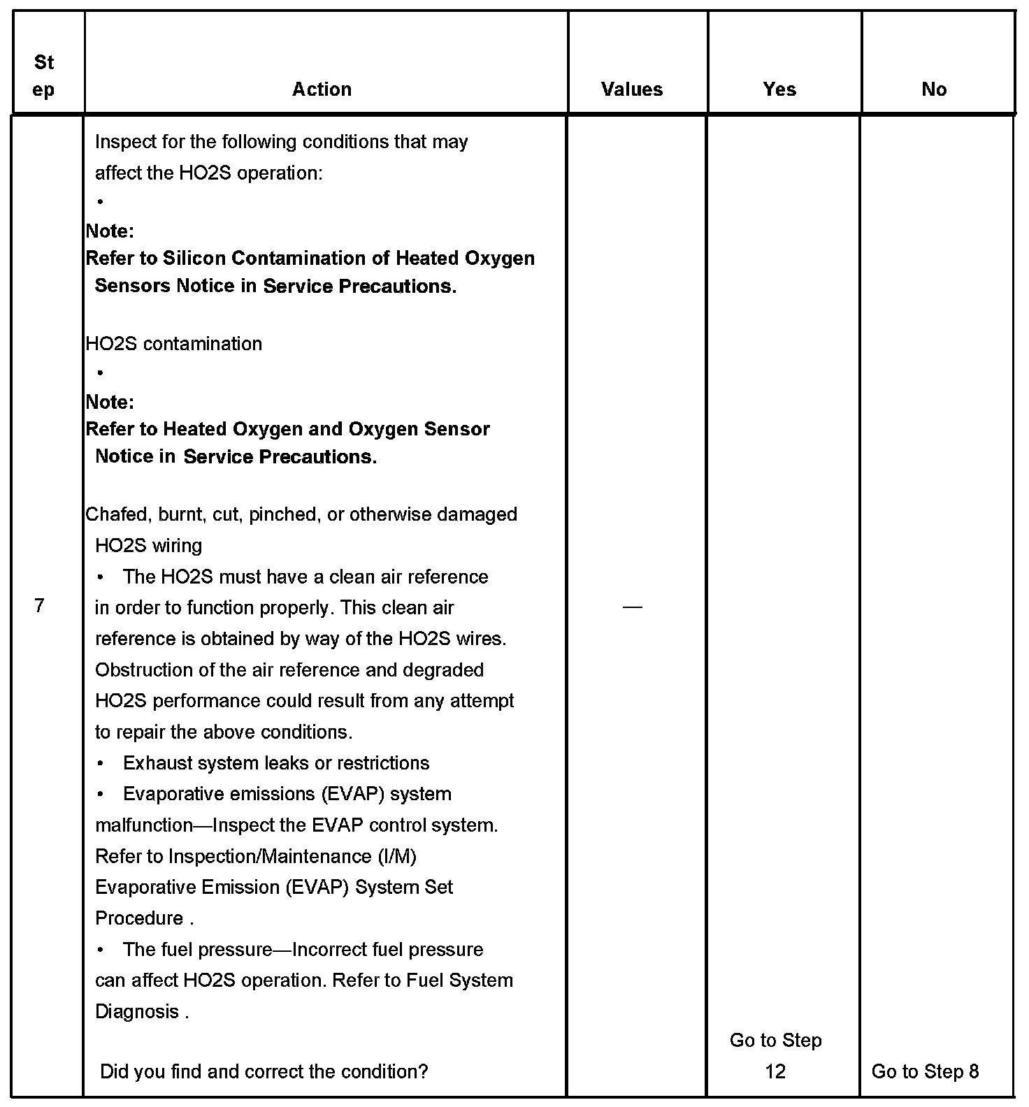 7. The conditions listed in the table may contribute to the failure of the HO2S. The conditions listed apply only to this type of failure.