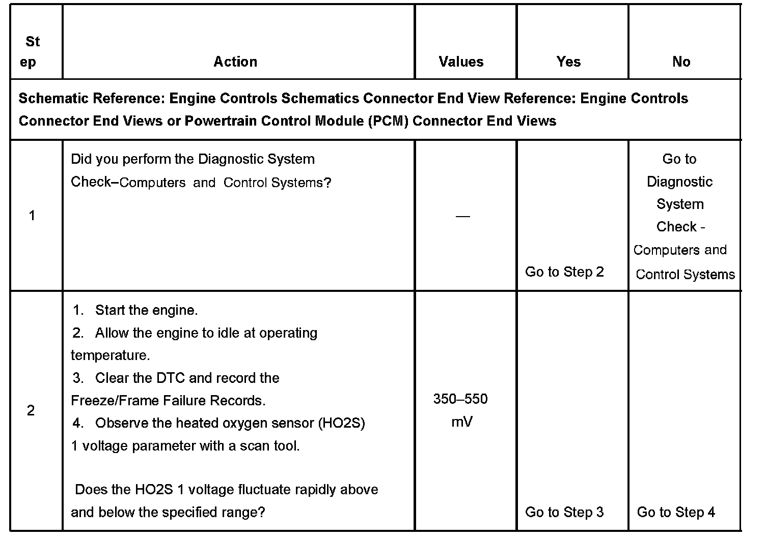 The PCM detects that the HO2S 1 signal voltage remains between 400-500 mV for more than 30 seconds.