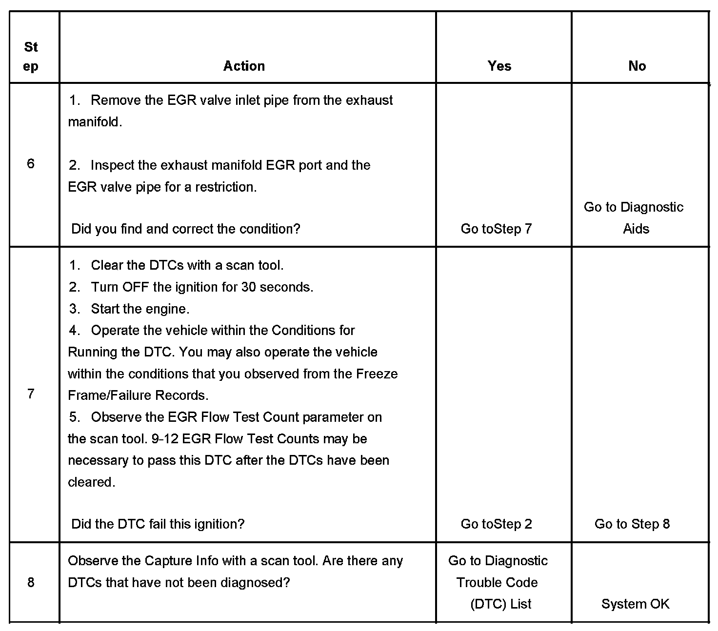 Normally, the PCM will only allow one EGR flow test during an ignition cycle. To aid in verifying a repair, the PCM will allow up to 12 EGR flow test counts during the first ignition cycle following a code clear event. Between 9-12 EGR flow test counts should be sufficient for the PCM to determine adequate EGR flow and pass the EGR flow test. If the PCM detects an EGR flow error, DTC P0401 sets.