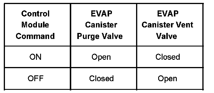 The table illustrates the relationship between the ON and OFF states, and the OPEN or CLOSED states of the EVAP canister purge and vent valves.