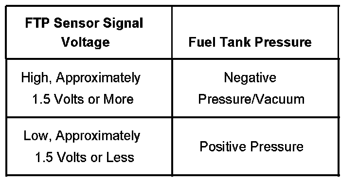 The table illustrates the relationship between FTP sensor signal voltage and the EVAP system pressure/vacuum.