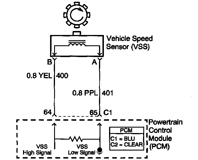 The vehicle speed sensor (VSS) system is a pulse generator consisting of a speed sensor assembly, located in the case extension, and a toothed vehicle speed sensor reluctor wheel, which is pressed onto the final drive carrier assembly. As the vehicle drives forward, the vehicle speed sensor reluctor wheel rotates. This rotation produces a variable AC signal in the pickup coil that is proportional to vehicle speed. The PCM uses this signal in order to calculate vehicle speed, shift timing and gear ratios.