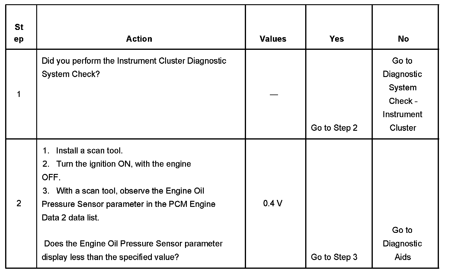 The engine oil pressure (EOP) sensor changes resistance based on engine oil pressure. The PCM monitors the signal circuit of the EOP sensor. When the oil pressure is high, the sensor resistance is high and the PCM senses a high signal voltage. When the oil pressure is low, the sensor resistance is low and the PCM senses a low signal voltage. The PCM sends the engine oil pressure information to the IPC via the class 2 serial data circuit.