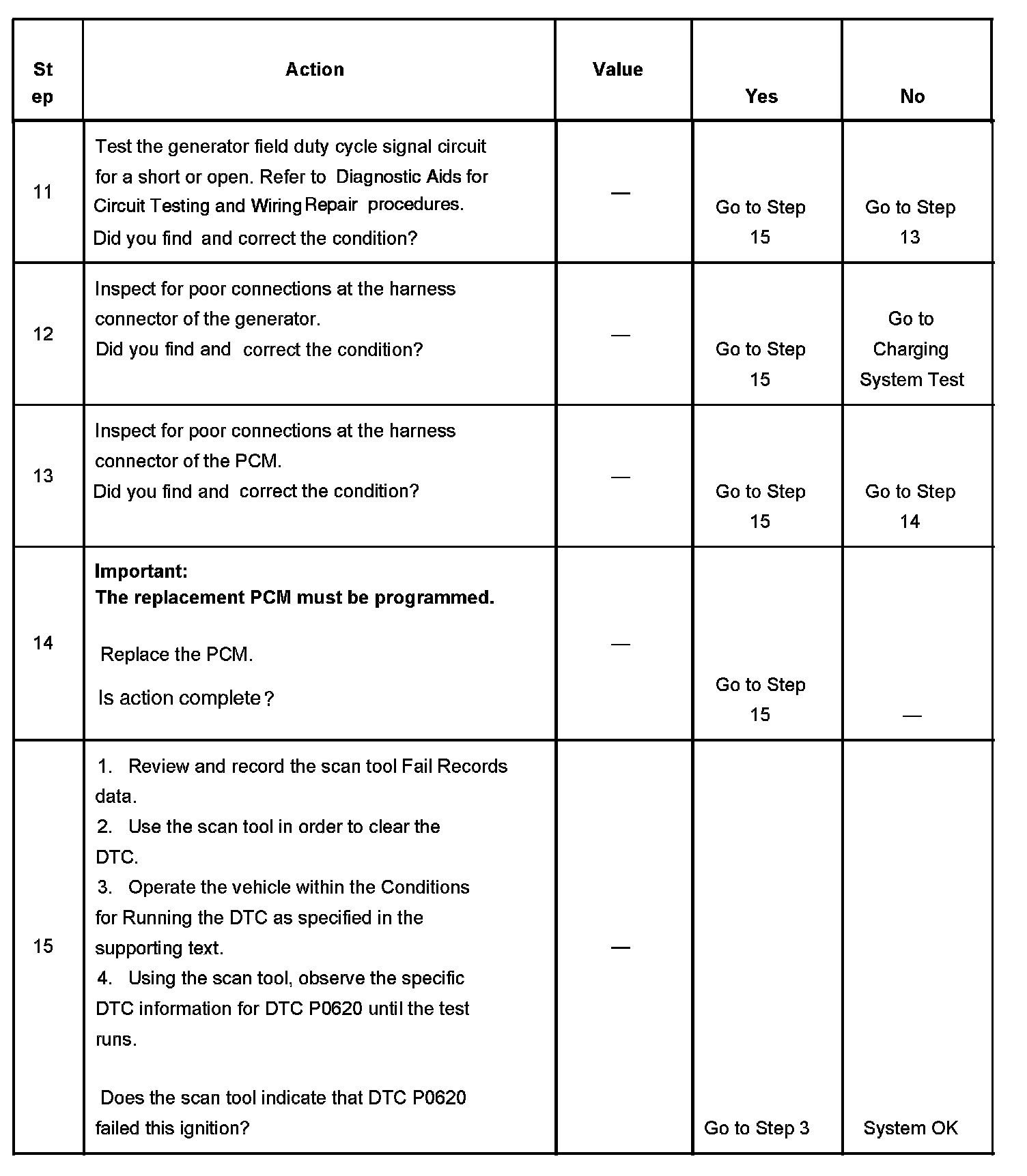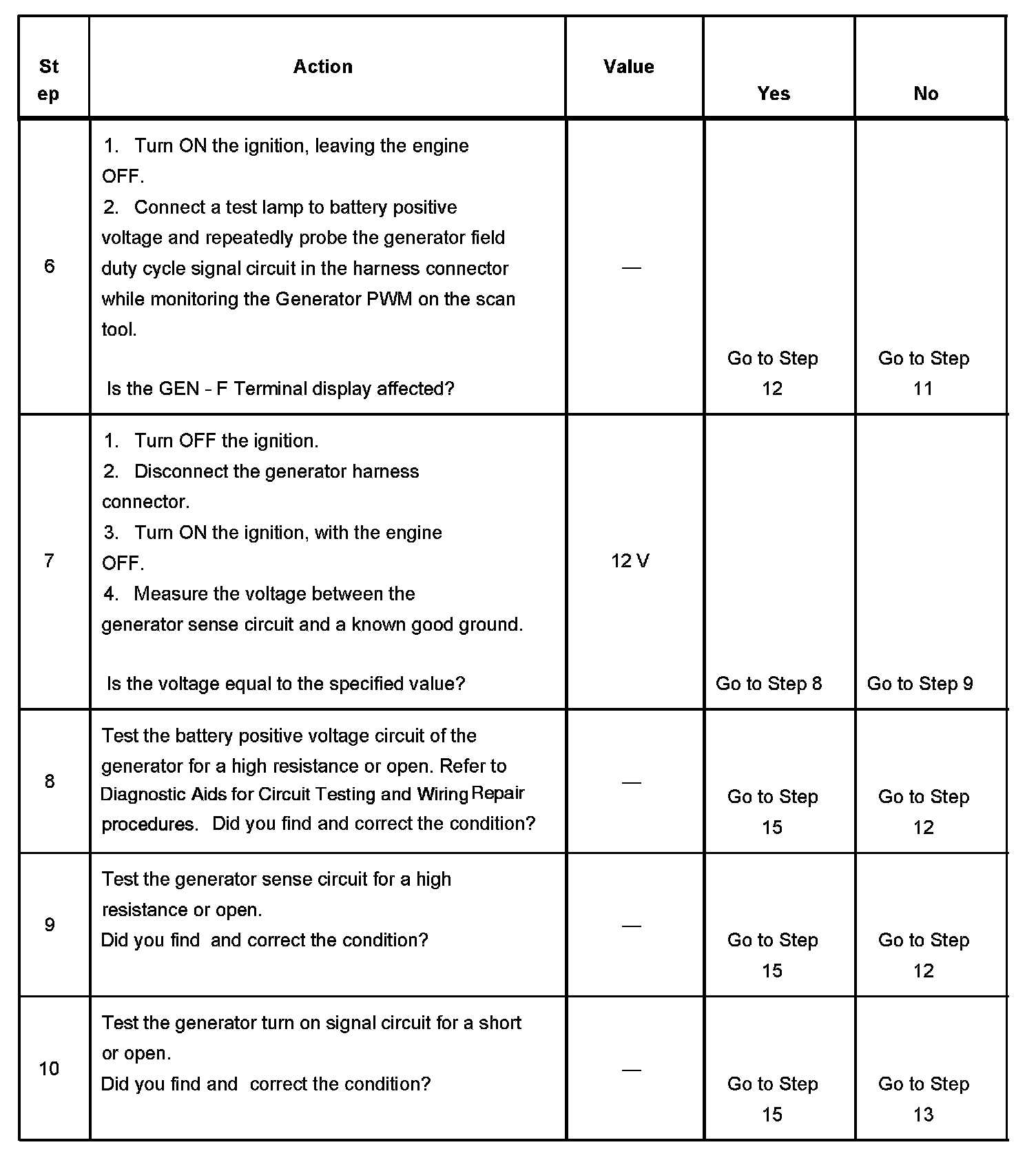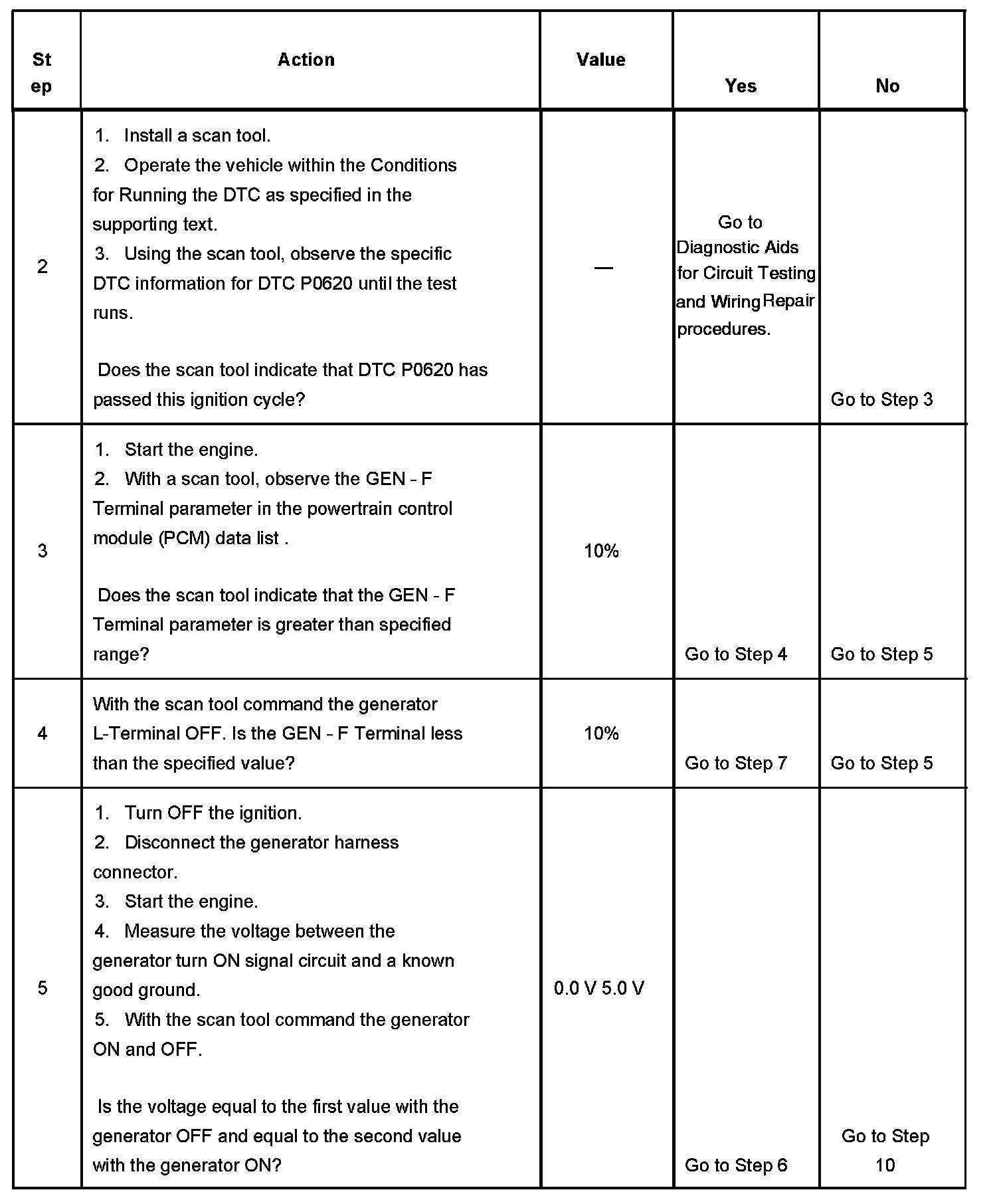 - The generator turn on signal circuit voltage is low while the PCM is commanding the generator ON.
