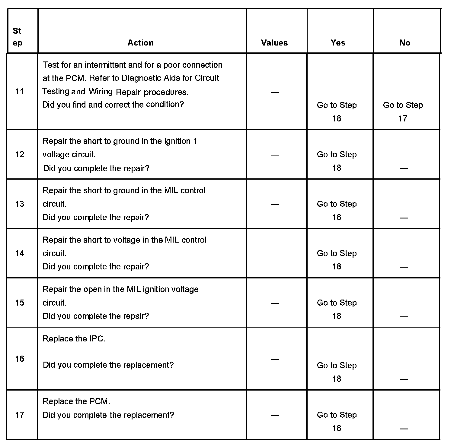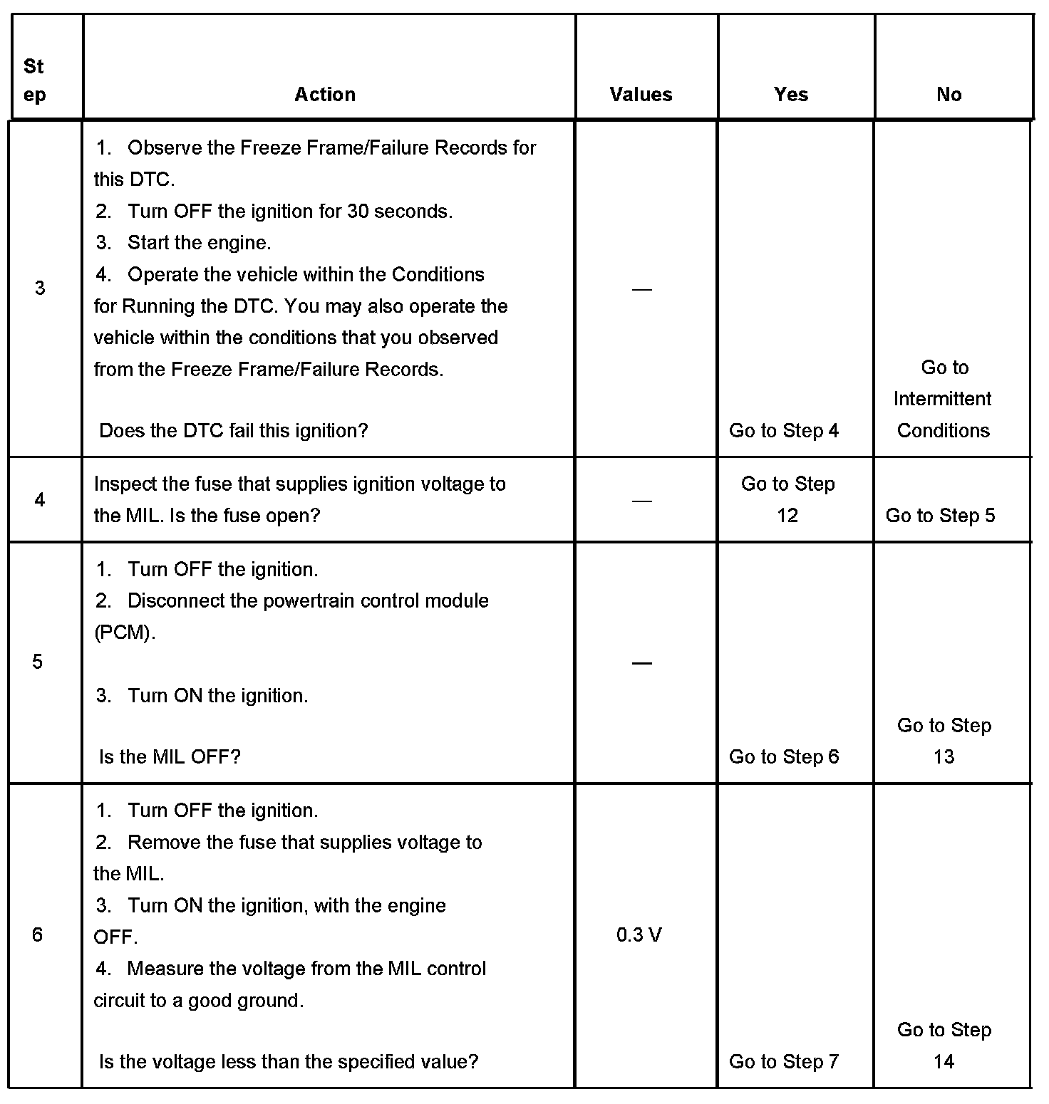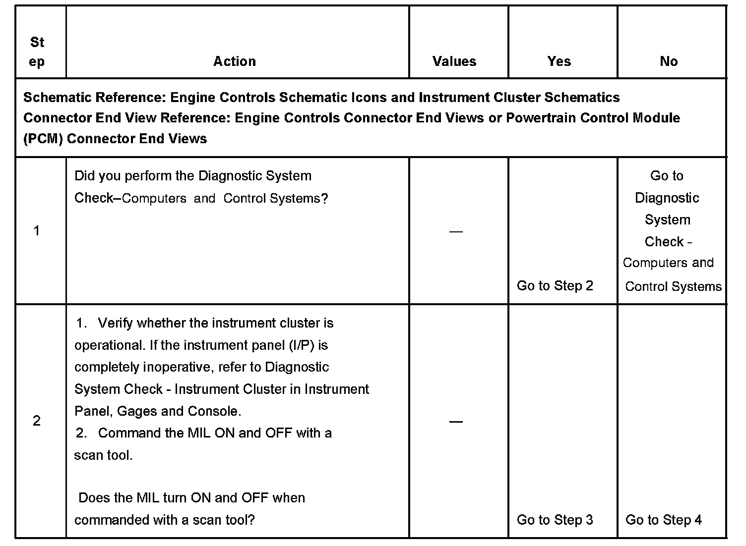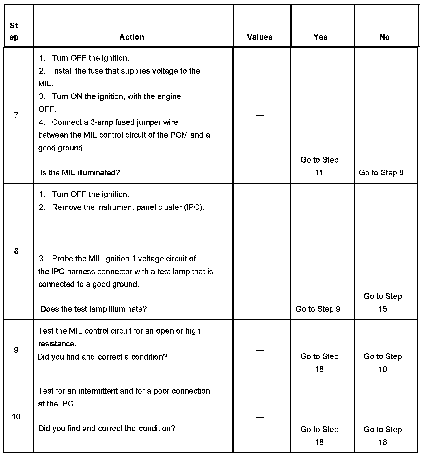 5. This step tests for a short to ground in the MIL control circuit. With the powertrain control module (PCM) disconnected and the ignition ON, the MIL should be OFF.