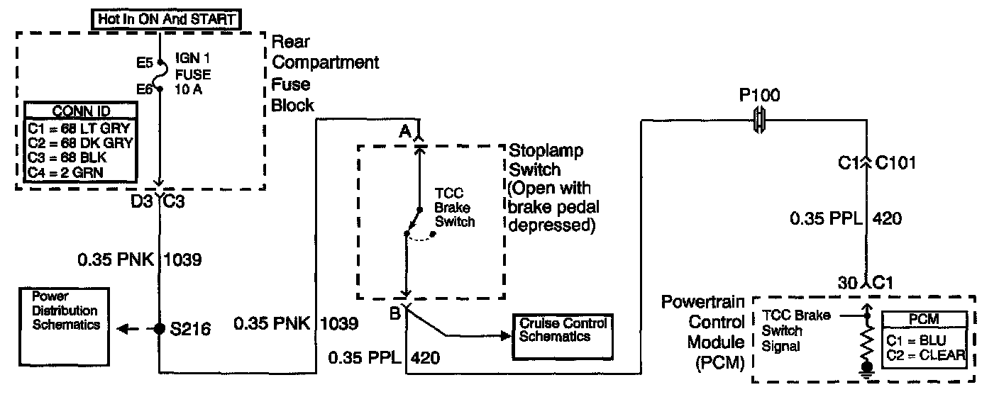 The TCC brake switch indicates brake pedal status to the PCM. The TCC brake switch indicates that the brake pedal is either applied or released. The normally-closed switch supplies battery voltage to the PCM. Applying the brake pedal opens the TCC brake switch, interrupting voltage to the PCM. When the PCM receives 0 volts at the TCC brake switch input, the PCM turns OFF the torque converter clutch pulse width modulation (TCC PWM) solenoid valve.