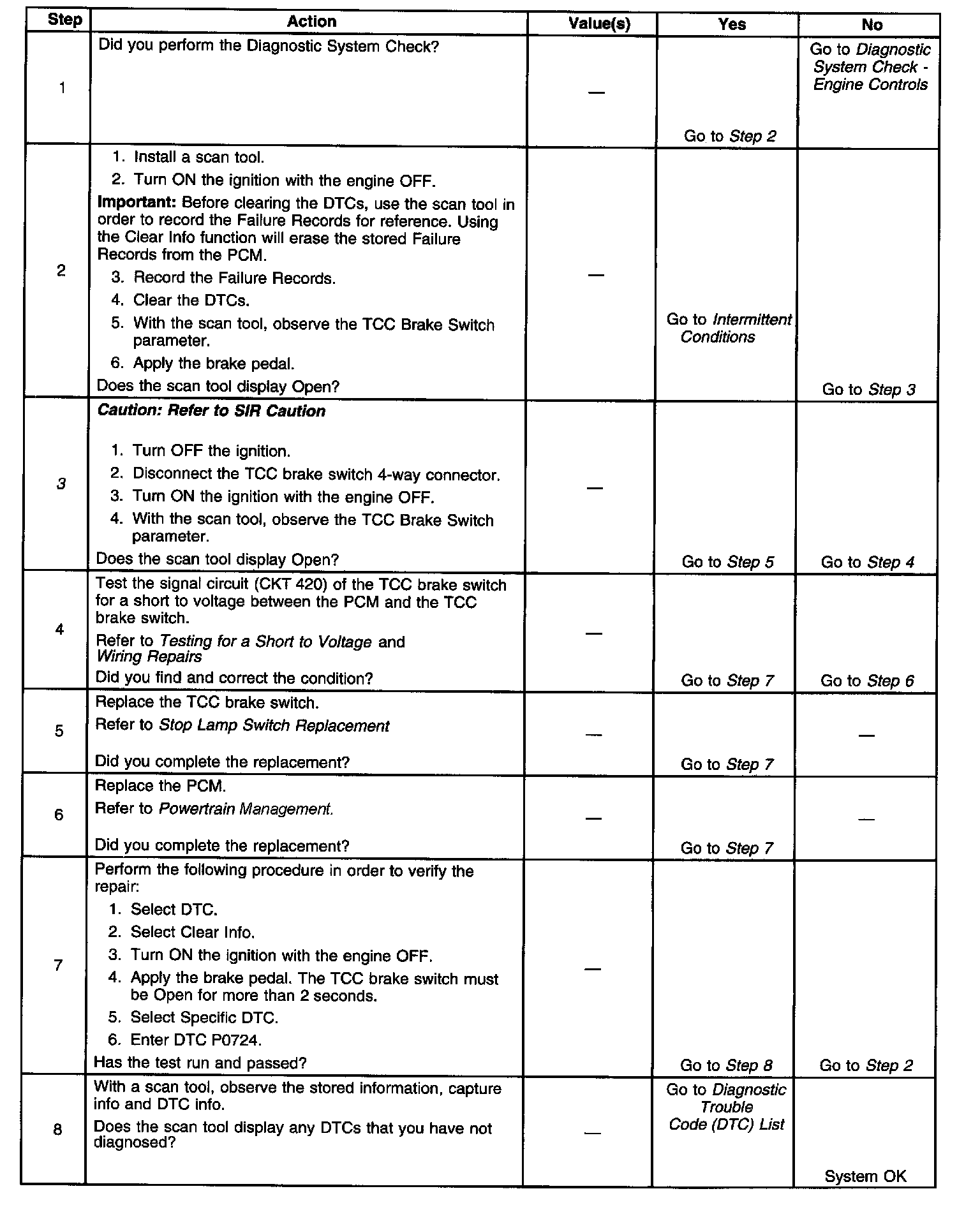 If the PCM detects a closed TCC brake switch indicating pedal released, during a number of decelerations, then DTC P0724 sets. DTC P0724is a type C DTC.