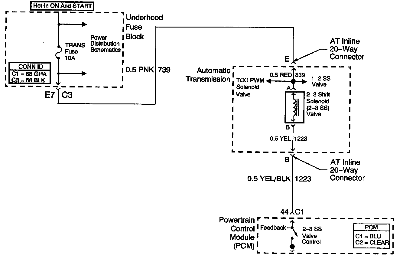 The 2-3 shift solenoid (2-3 SS) valve controls transmission fluid pressure acting on the 1-2 and 2-3 shift valves to position the valves for the appropriate gear. The 2-3 SS valve is a normally-open exhaust valve located on the control valve body. A fused circuit supplies ignition voltage to the 2-3 SS valve. The PCM commands the solenoid ON or OFF by switching the ground path. When the 2-3 SS valve is commanded ON, the PCM senses low voltage. When the 2-3 SS valve is commanded OFF, the PCM senses high voltage.
