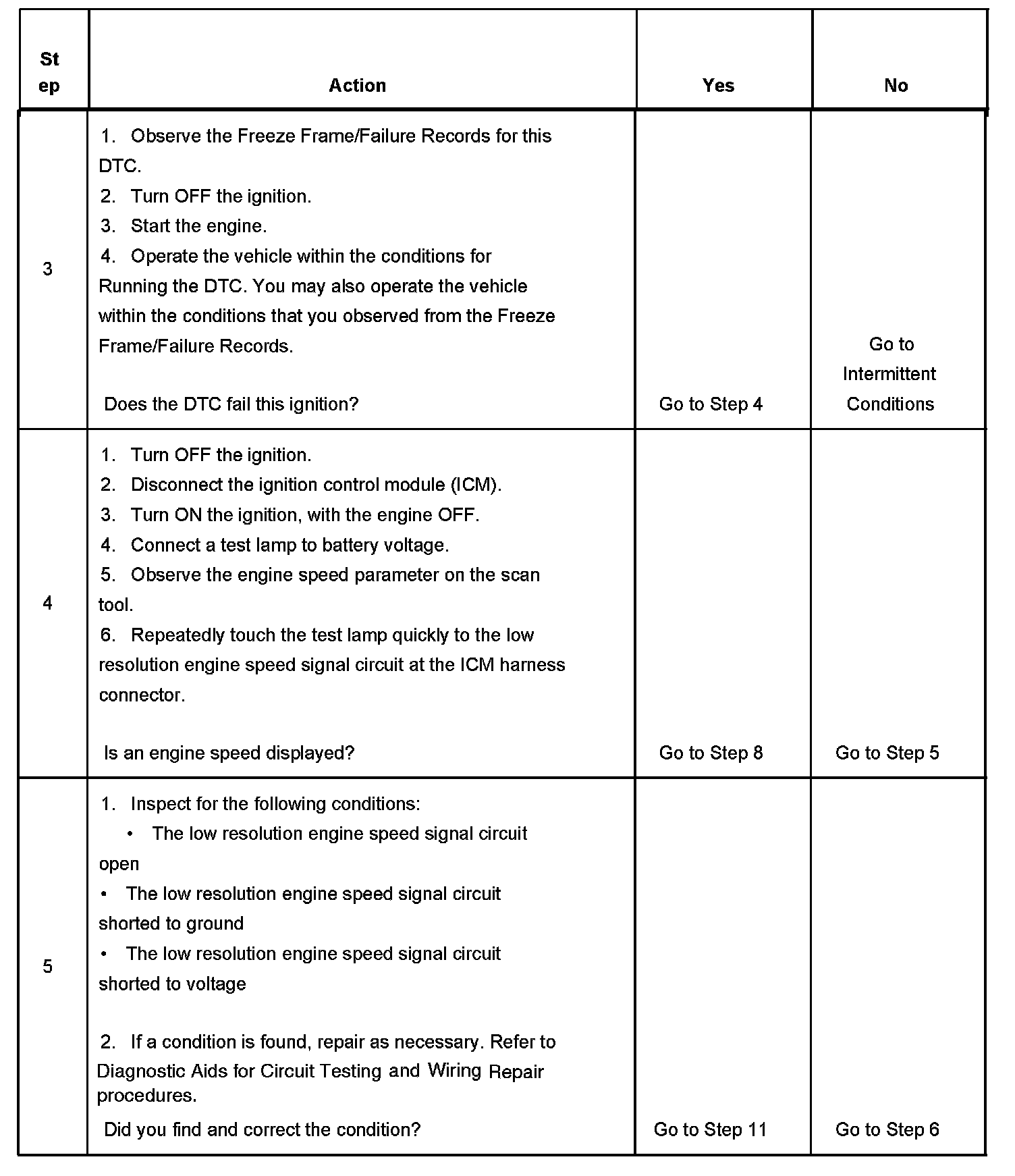 CIRCUIT DESCRIPTIONThe 3X reference signal is produced by the ignition control module (ICM). The ICM calculates the 3X reference signal by dividing the crankshaft position (CKP) sensor 18X pulses by 3 when the engine is running and CKP sync pulses are also being received. The powertrain control module (PCM) uses the 3X reference signal to calculate engine RPM and crankshaft position at engine speeds above 1,200 RPM. The PCM also uses the pulses on this circuit to initiate injector pulses. The PCM constantly monitors the number of pulses on the 3X reference circuit and compares the number of 3X reference pulses to the number of 18X reference pulses and CAM signal pulses being received. The PCM will use the 18X reference signal circuit for fuel and ignition control. The engine will continue to start and run using the 18X reference and camshaft position PCM input signals only. If the PCM detects an incorrect number of pulses on the 3X reference circuit, DTC P1374 sets.