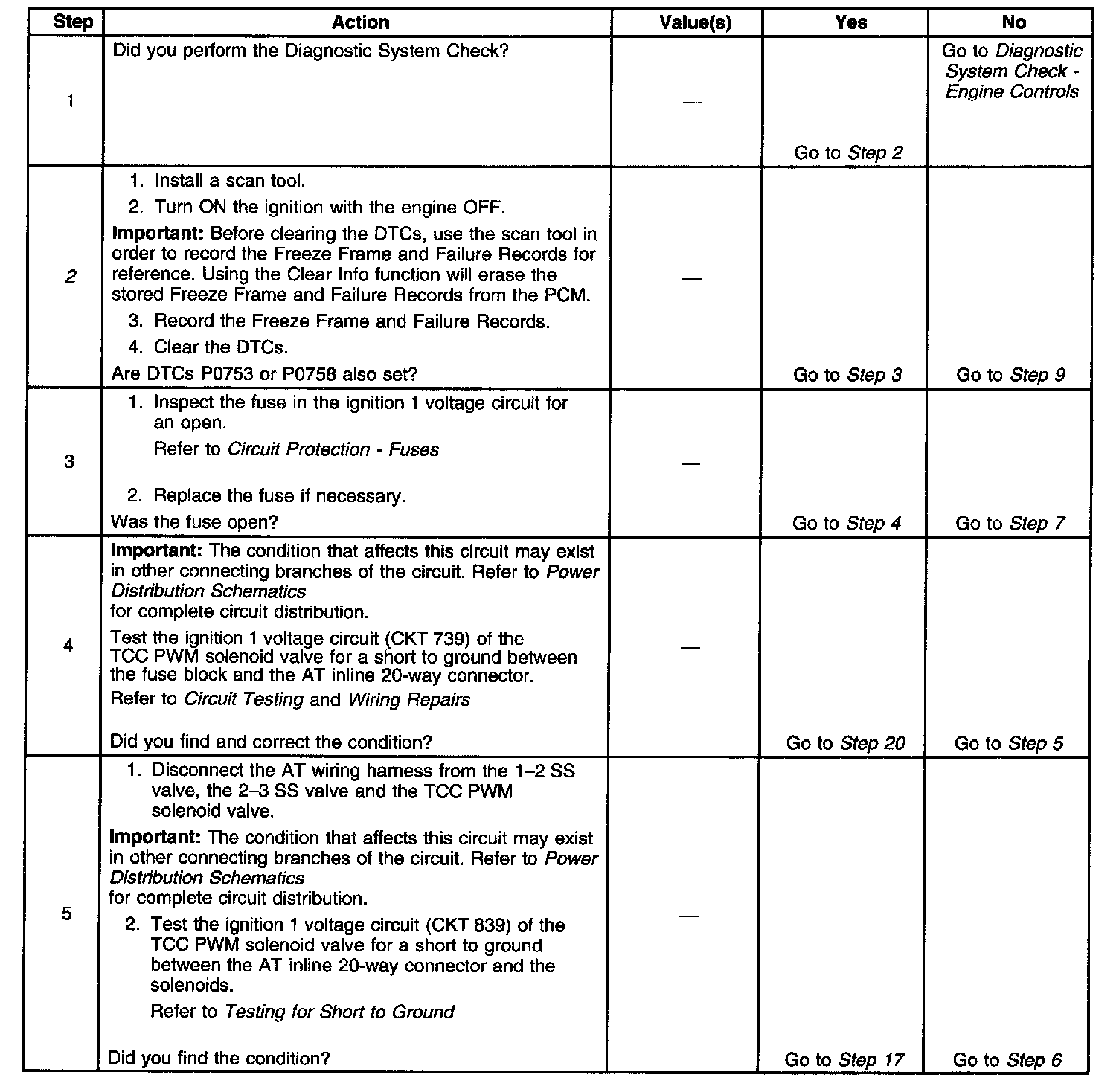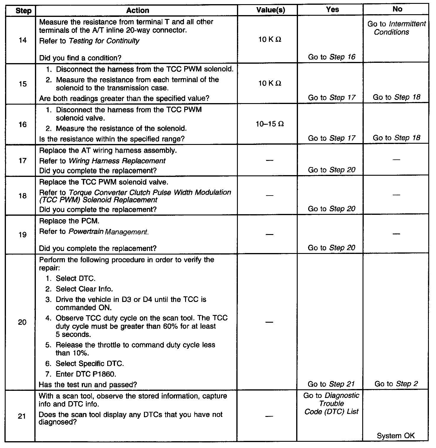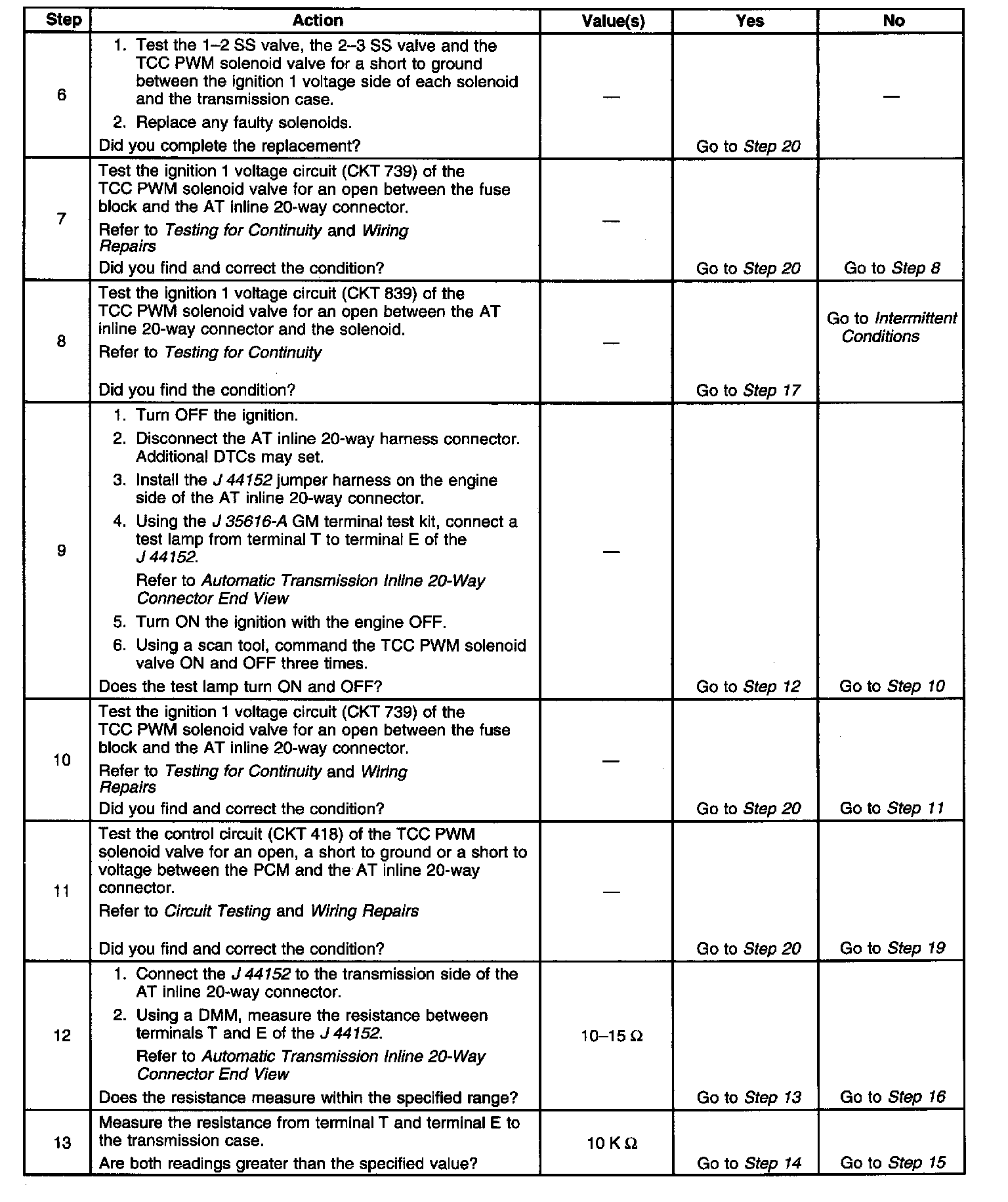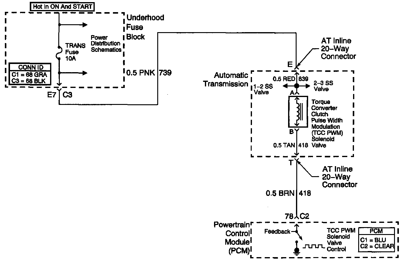 Ignition voltage is provided to the torque converter clutch pulse width modulation (TCC PWM) solenoid valve. The PCM controls the solenoid with a negative duty cycle in order to control application and release of the TCC. When the solenoid is commanded OFF, the PCM senses high voltage. When the solenoid is commanded ON, the PCM senses low voltage.