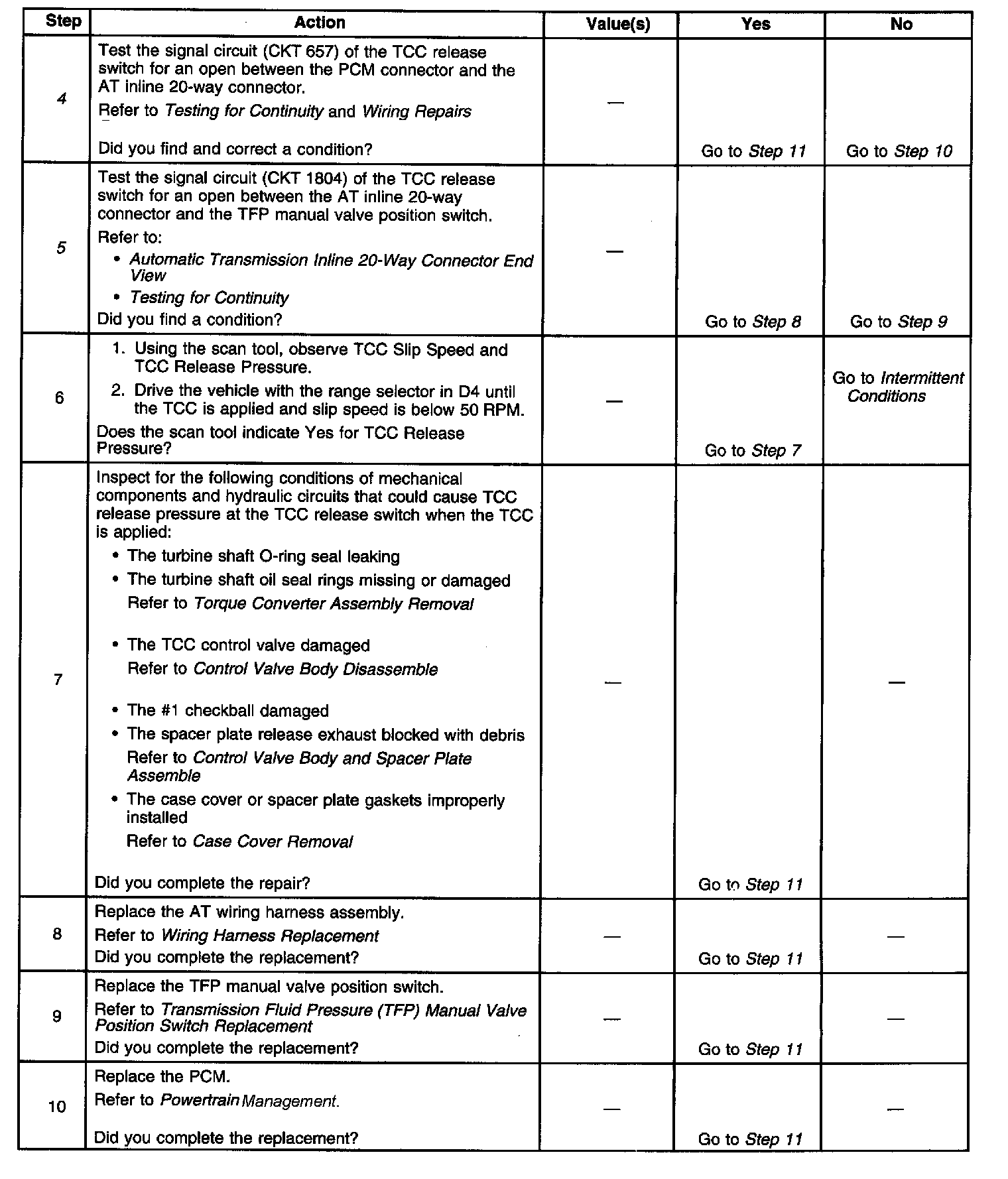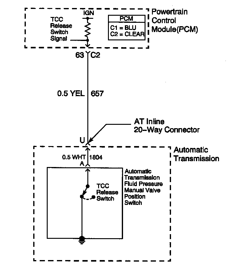 The TCC release switch is part of the transmission fluid pressure (TFP) manual valve position switch. The TFP manual valve position switch is mounted to the transmission valve body. The TCC release switch is normally-closed.The switch signals the PCM that the TCC is released. This is accomplished by torque converter release fluid pressure acting on the switch contact which opens the circuit. When the circuit voltage is high, the PCM recognizes that the TCC is no longer engaged.
