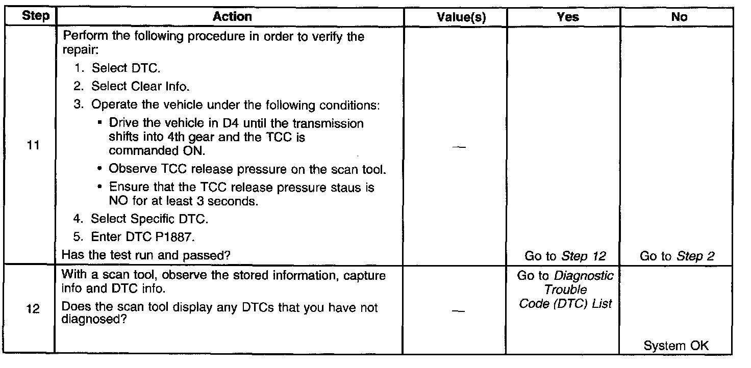 If the PCM determines that the TCC release switch is open indicating that the TCC is not applied and the TCC slip speed indicates that the TCC is applied, then DTC P1887 sets. DTC P1887 is a type B DTC.