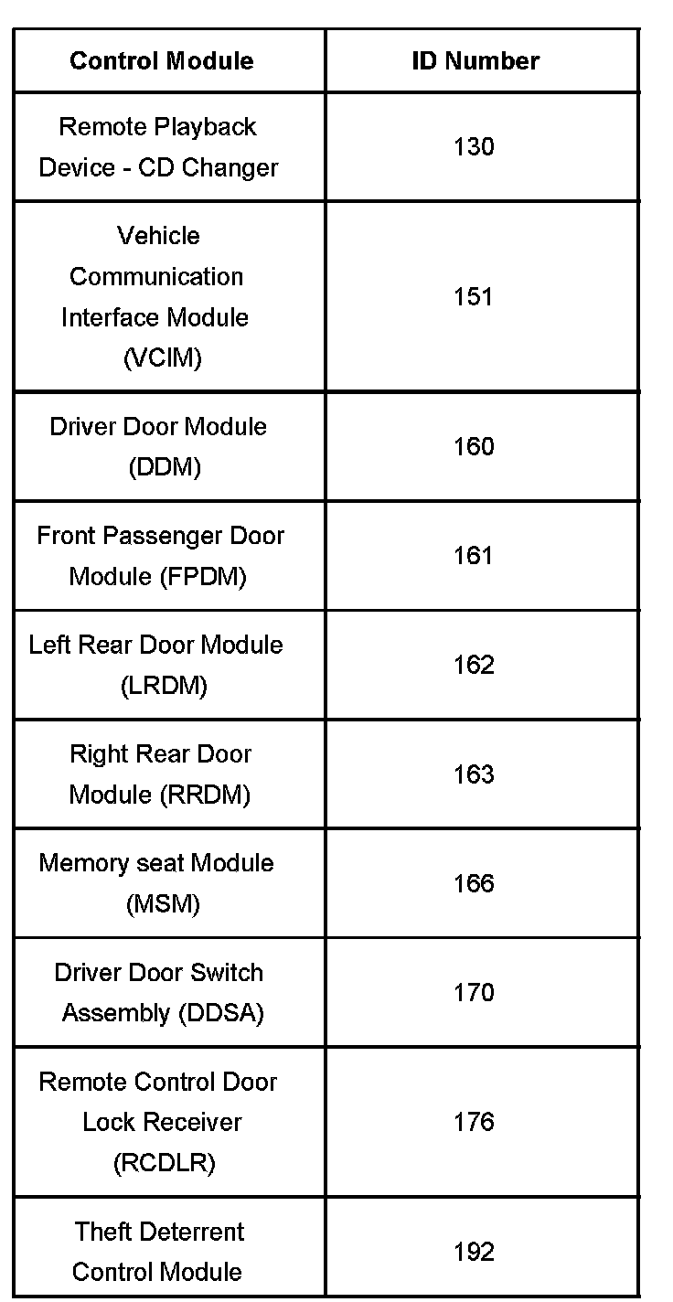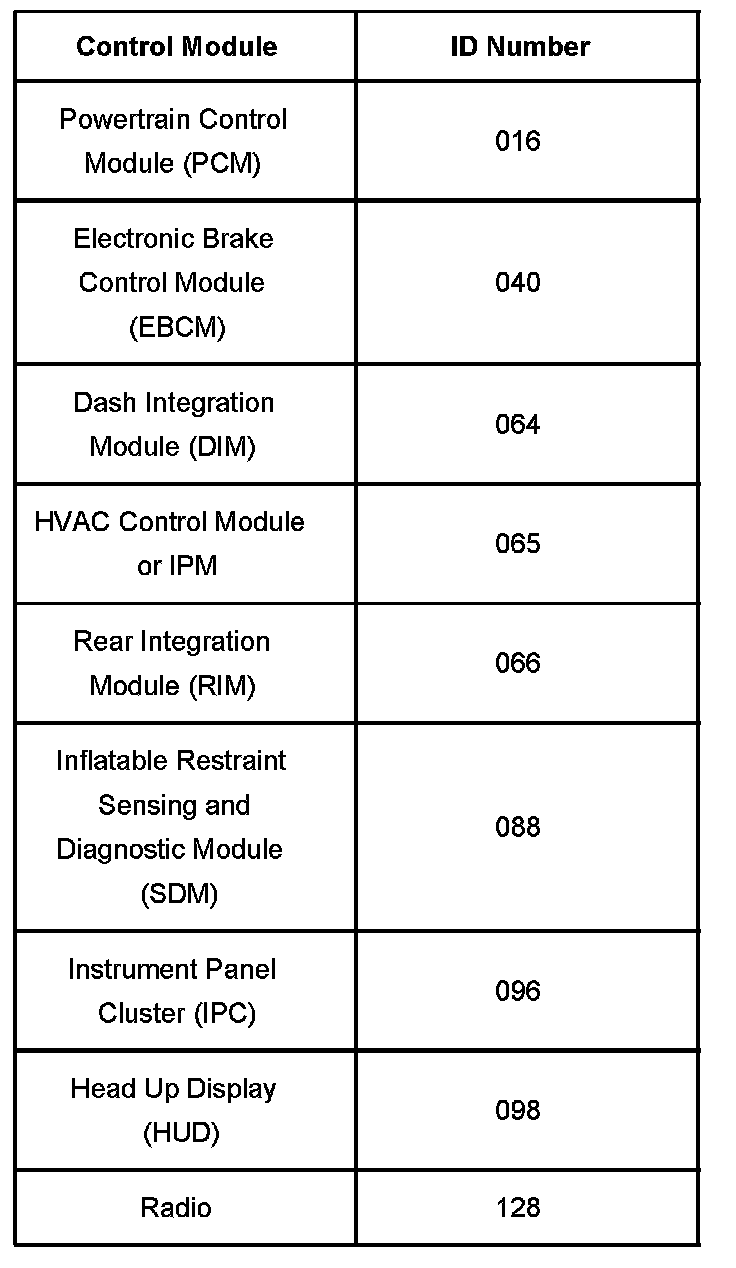 The control module ID number list provides a method for determining which module is not communicating. A module with a class 2 serial data circuit malfunction or which loses power during the current ignition cycle will have a Loss of Communication DTC set by other modules that depend on information from that failed module. The modules that can communicate will set a DTC indicating the module that can not communicate. When no message is detected from a learned identification number for 5 seconds, a DTC U1XXX where XXX is equal to the 3 digit identification number is set.