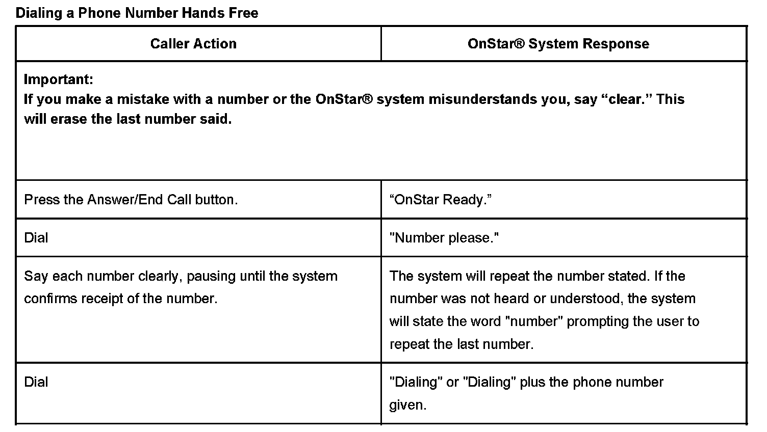 During a hands free call, the microphone and audio system operate the same way as a standard OnStar(R) call. When the answer/end call button is pressed, the audio system will mute; the OnStar(R) system will then return the prompt "OnStar Ready". At this point there are specific commands set to initiate a cellular call. If the vehicle receives a call when the radio is on, the audio system will mute and an audible ring will be heard though the speakers. The call will be answered when the answer/end call button is pressed.