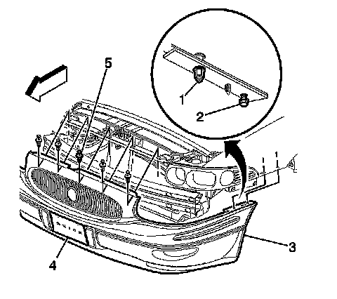 5. Install the push pin retainers (5) in order to secure the front bumper fascia (3) to the upper fascia support.