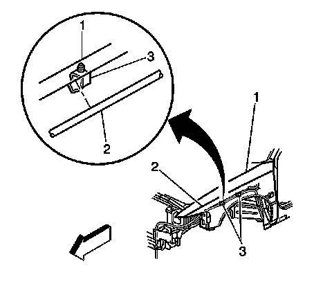 6. Open the clips (3) retaining the hood release cable (2) to the vehicle.