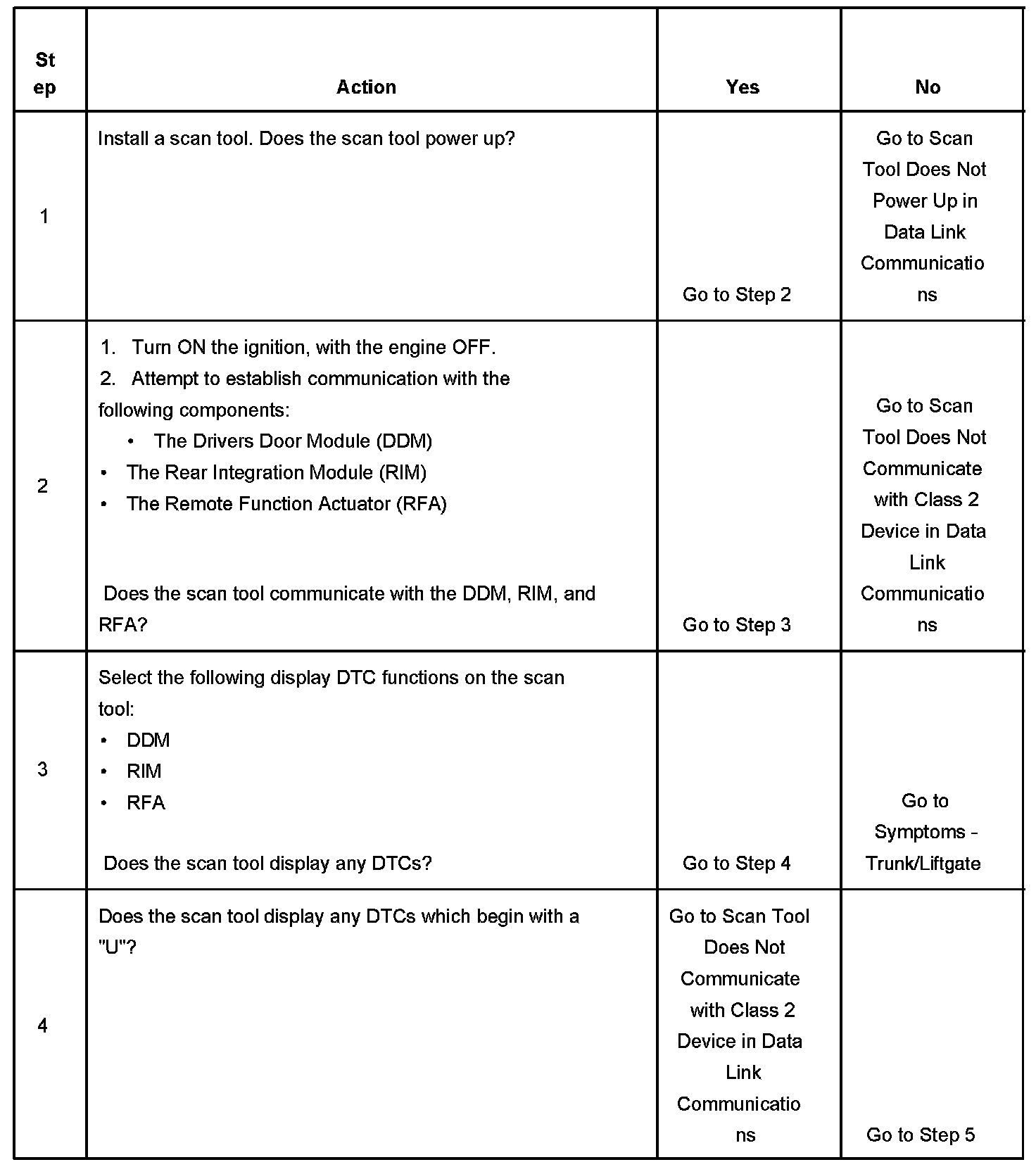 6. At this point you have determined all DTCs applicable to the Body Rear End system. Refer to Symptoms - Trunk/Liftgate for further Body Rear End diagnosis. Any other codes displayed from the listed modules do not apply to Body Rear End and should be diagnosed in their applicable section. Symptom Related Diagnostic Procedures