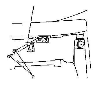 3. Loosen the fasteners (2) holding the IP compartment striker (1) to the IP.