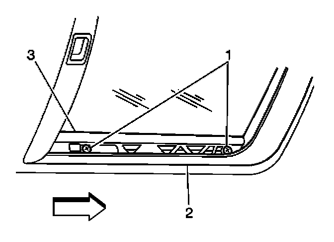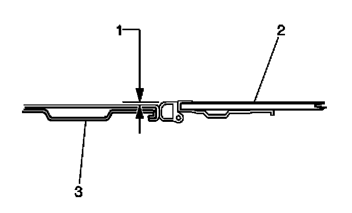 6. Adjust the rear of the sunroof window (2) from flush to 1 mm (0.04 in) (1) above the top surface of the roof panel (3).