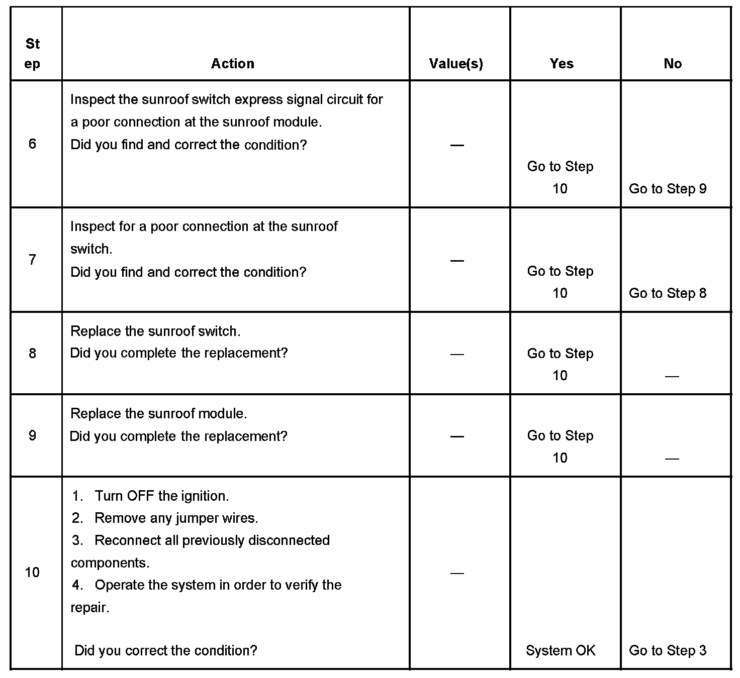 The numbers below refer to the step numbers on the diagnostic table.