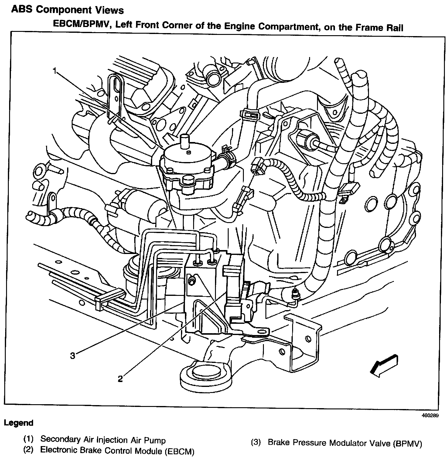 ABS Component Views - EBCM/BPMV, Left Front Corner Of The Engine Compartment, On The Frame Rail: