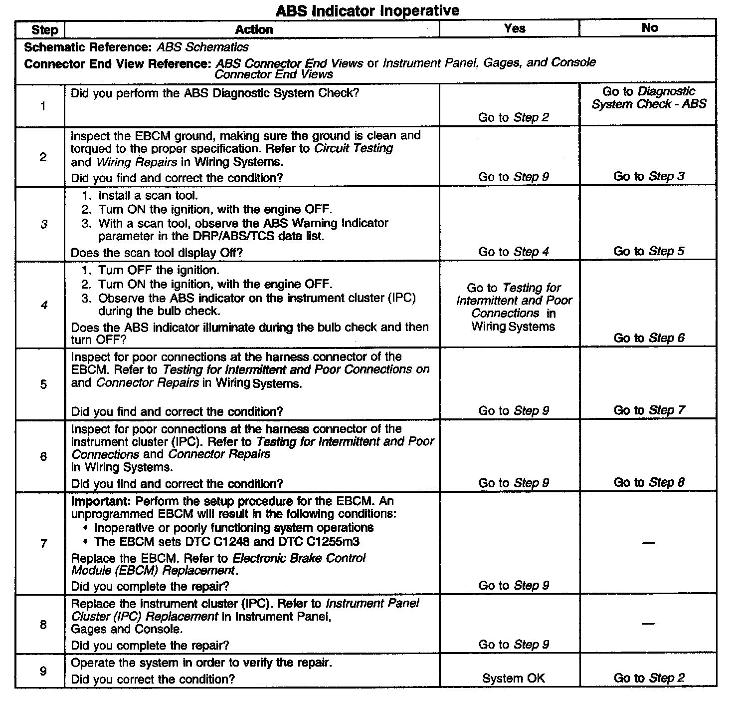 The instrument cluster controls the operation of the ABS indicator. The EBCM reports the desired status of the ABS indicator via serial data messages. The ABS indicator signal circuit is a back-up reporting circuit to the serial data messages. The EBCM supplies ground through the circuit when the ABS is operating properly. When there is a problem with ABS that should turn on the ABS indicator, the EBCM opens the ABS indicator signal circuit. If there is a problem with the ABS serial data messages, the instrument cluster uses the ABS indicator signal to determine if the ABS indicator should be illuminated. Using the serial data messages and back-up circuit, the instrument cluster decides whether to turn on the ABS indicator.