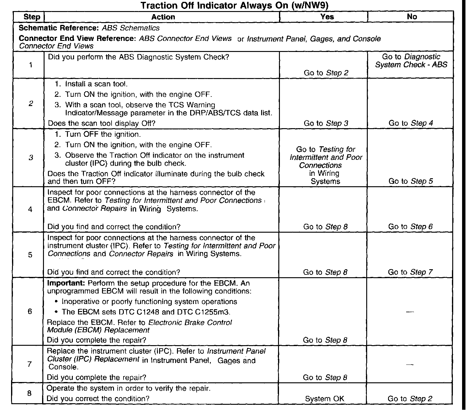 The Traction Off indicator is controlled by the instrument cluster via serial data messages from the EBCM. When the heater and A/C control (w/C67) or the instrument panel module (IPM) (w/CJ2) sees the traction control switch input grounded through the momentary traction control switch, it sends a serial data message to the EBCM that tells the EBCM that the traction control switch has been pressed. The EBCM then disables traction control and sends a message to the instrument cluster to turn the Traction Off indicator ON. Each time the ignition is cycled from OFF to ON, the traction control system is enabled.