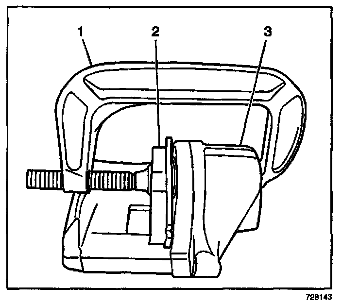 11. Install a large C-clamp (1) over the body of the brake caliper (3) with the C-clamp ends against the rear of the caliper body and against an old inner brake pad or a wood block (2) installed against the caliper piston.